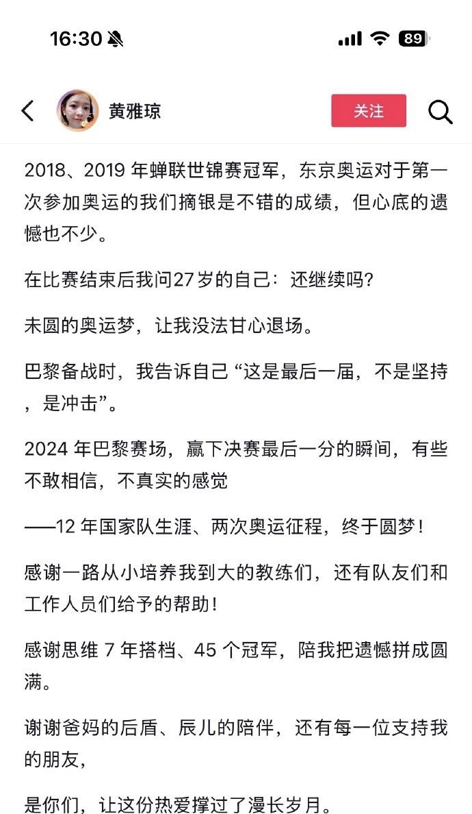2024年巴黎赛场,赢下决赛最后一分的瞬间,有些不敢相信,不真实的感觉。12年国家队生涯、两次奥运征程,终于圆梦!感谢一路从小培养我到大的教练们,还有队友们和工作人员们给予的帮助!感谢思维7年搭档、45个冠军,陪我把遗憾拼成圆满。谢谢爸妈的后盾、辰儿的陪伴,还有每一位支持我的朋友,是你们,让这份热爱撑过了漫长岁月。