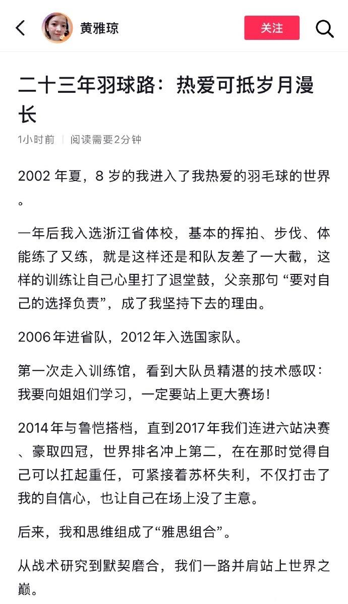 虎扑12月22日讯黄雅琼发文回顾二十三年羽球路,全文如下: