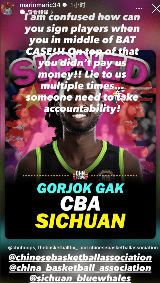 虎扑12月23日讯近日,前四川外援马林-马里奇更新社媒炮轰四川男篮欠薪。