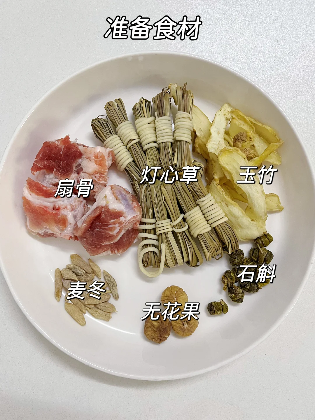 最近总熬夜,感觉🔥气好大😭 闺蜜教我煲了这个石斛灯心草麦冬扇骨汤,连续喝几次真的清爽很多!分享给你们,做法超简单👇 准备食材🫕 扇骨200克 灯心草1小把 麦冬1小把 石斛6颗 无花果干3颗 玉竹10g 做法🥘 1⃣️ 所有食材清洗干净,扇骨用淀粉洗净 2⃣️ 食材放入电炖锅内,加满清水 3⃣️ 电炖锅慢炖2小时,出锅前加点盐就好 💡喝到嘴是淡淡的甘甜,喉咙很润~晚上睡不好、容易心烦的姐妹可以试试!食材都是清清润润的,煲一锅全家都能喝。