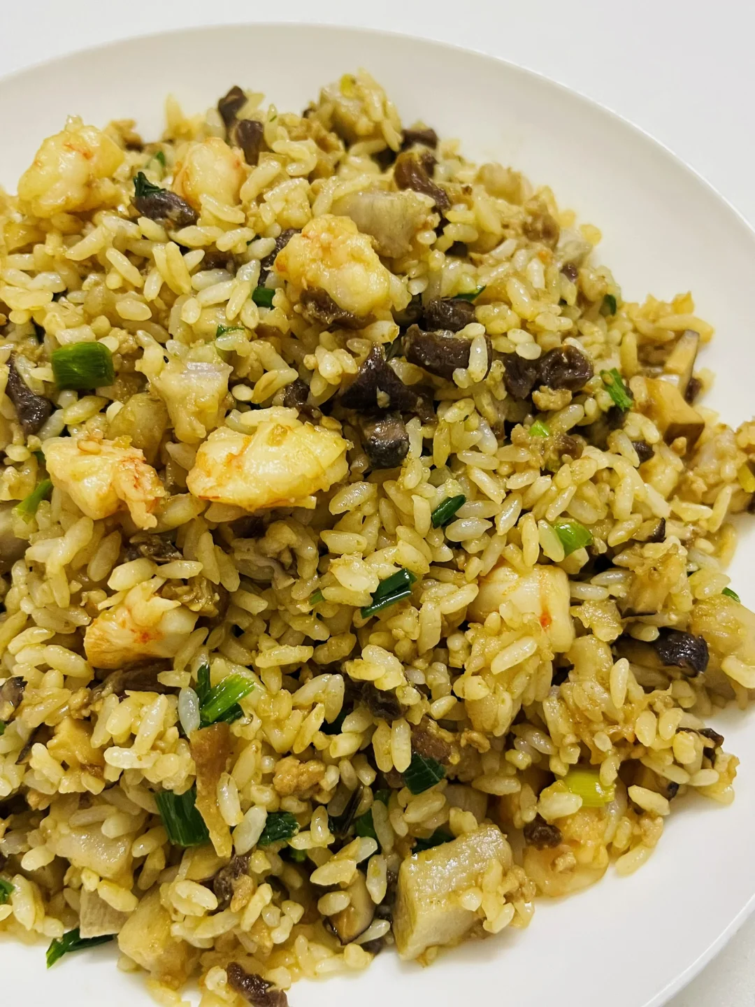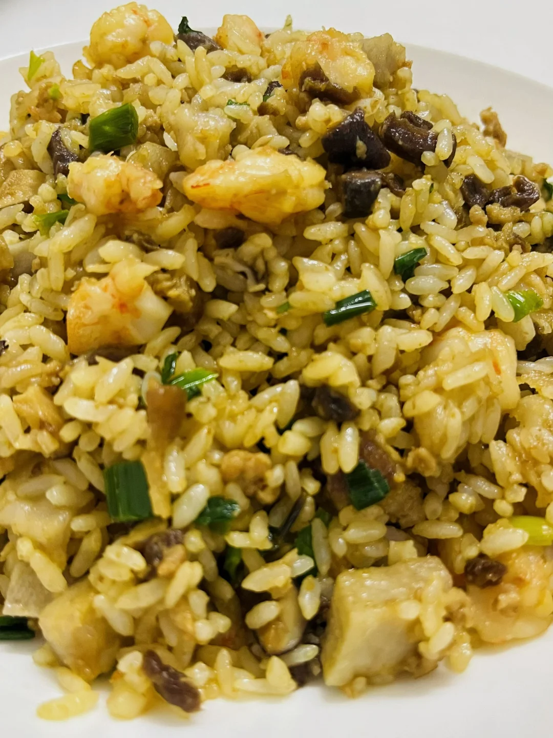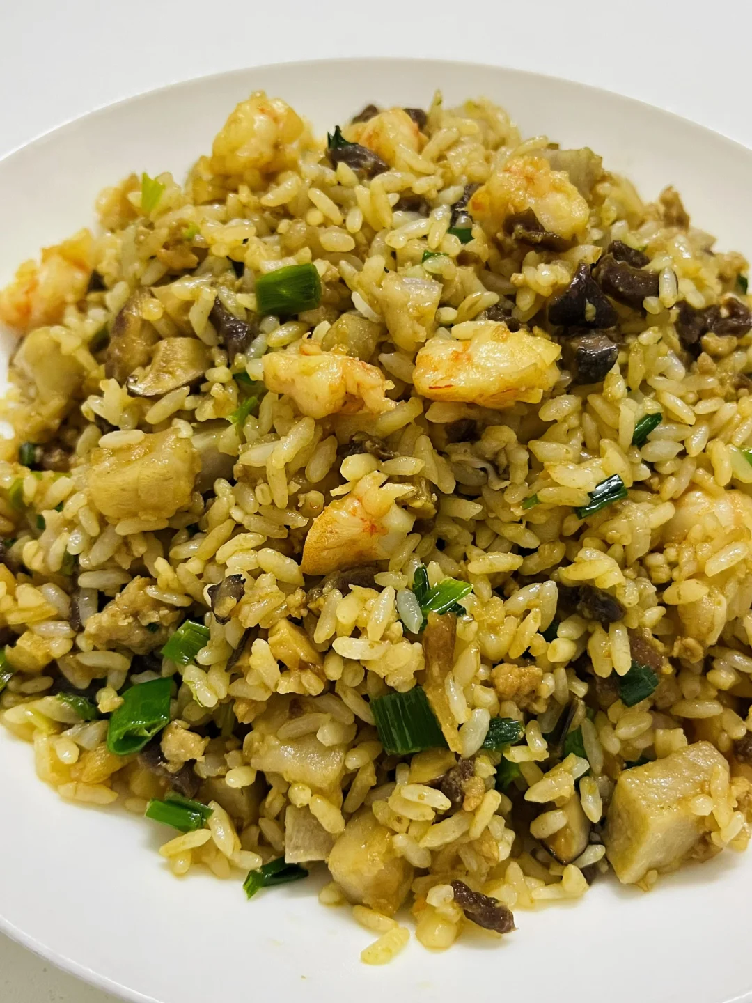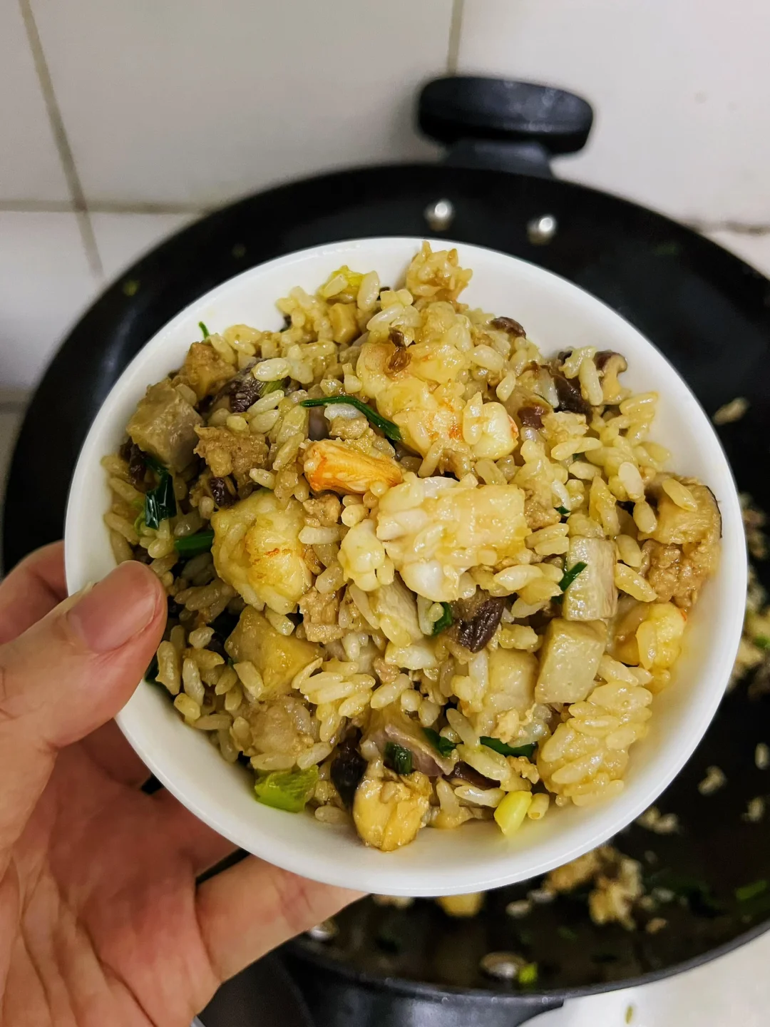 这饭真的绝了!老菜脯的咸香渗进每颗米里,芋头外酥内糯,虾仁弹嫩提鲜,一勺下去口感超丰富。