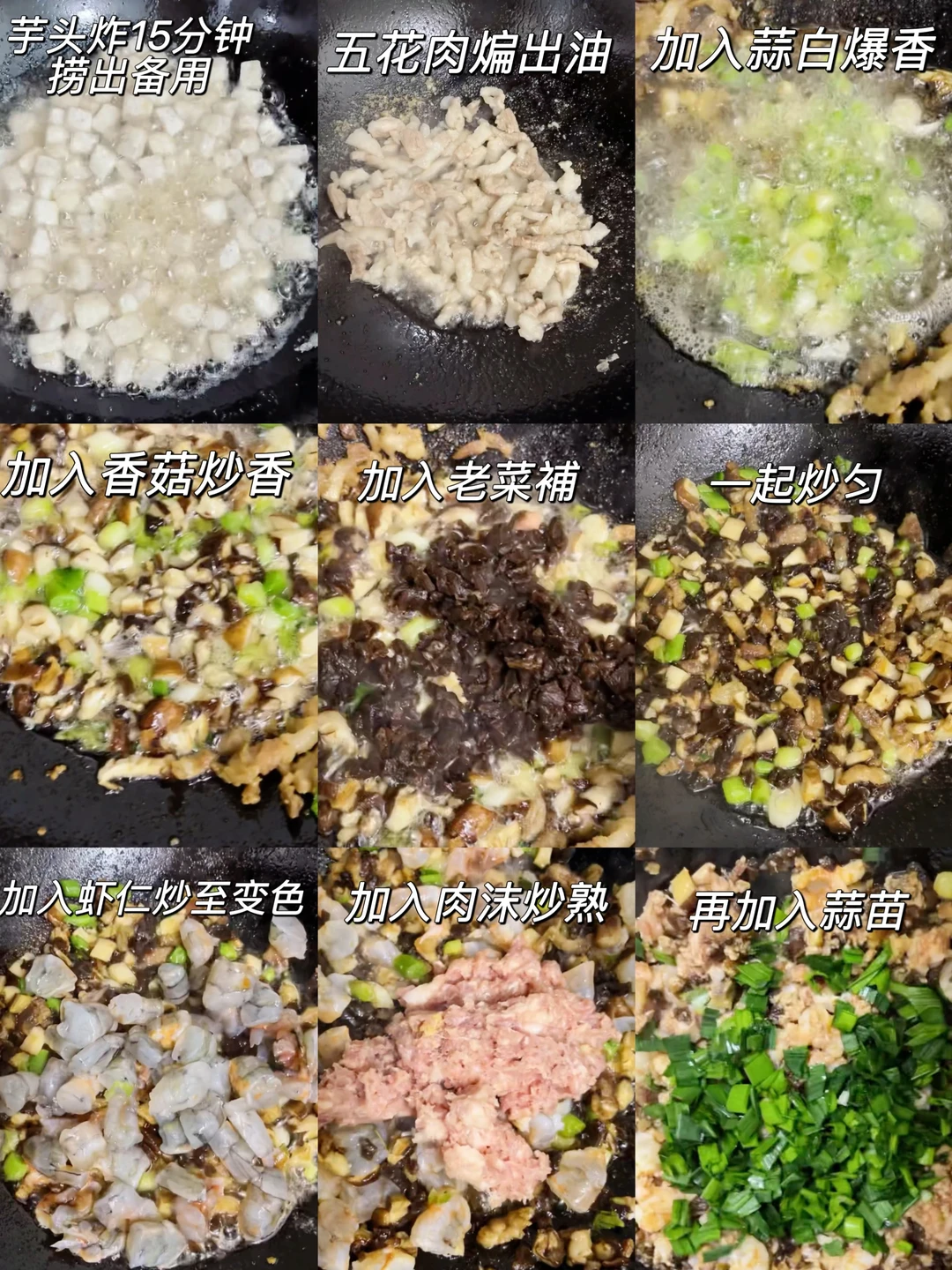 2️⃣ 芋头先炸15分钟熟透,捞出备用,五花肉煸出油,加入蒜白爆香,加入香菇,加入老菜脯炒匀炒香,再放虾仁肉沫炒熟(大概炒5分钟)。