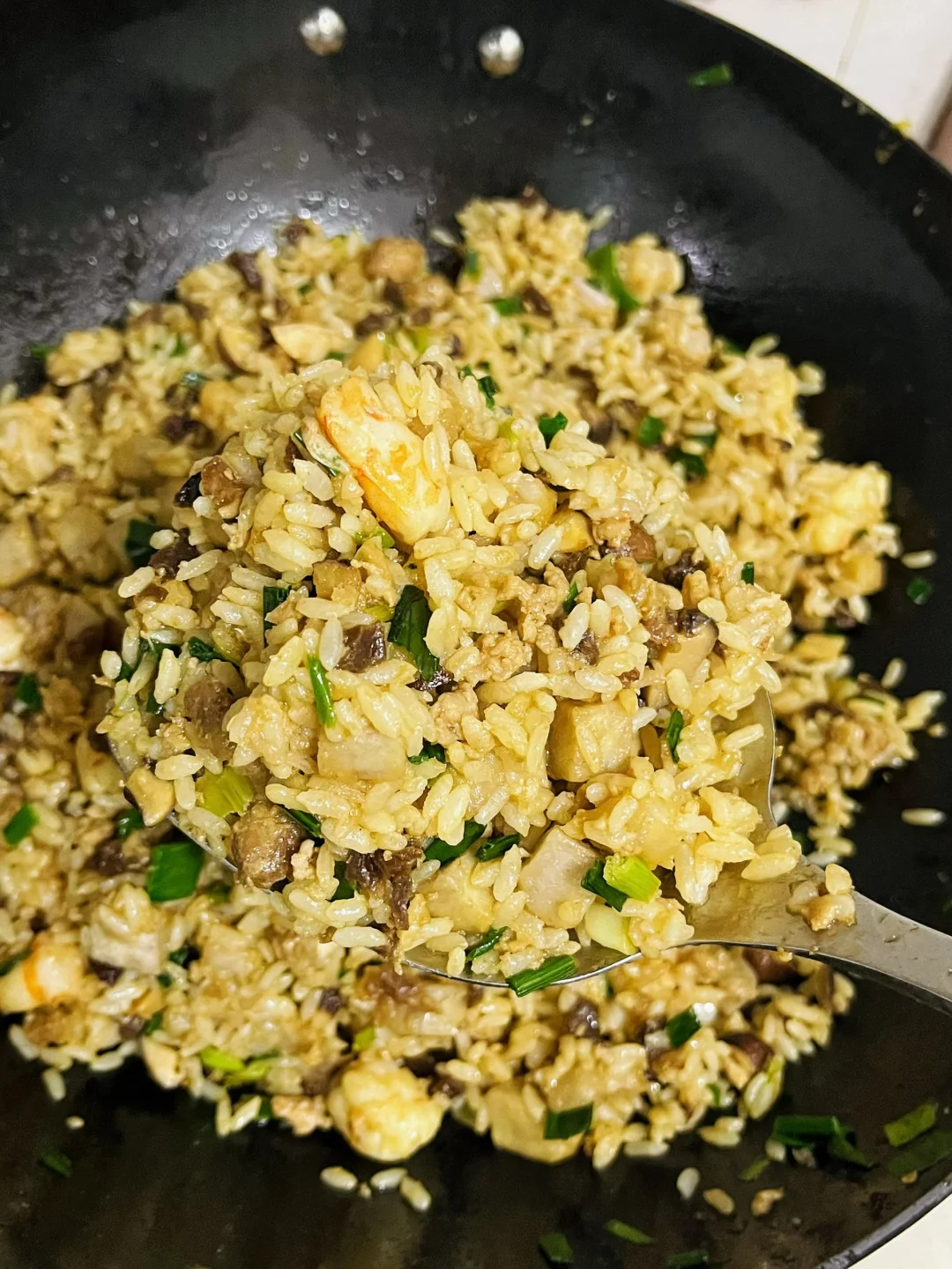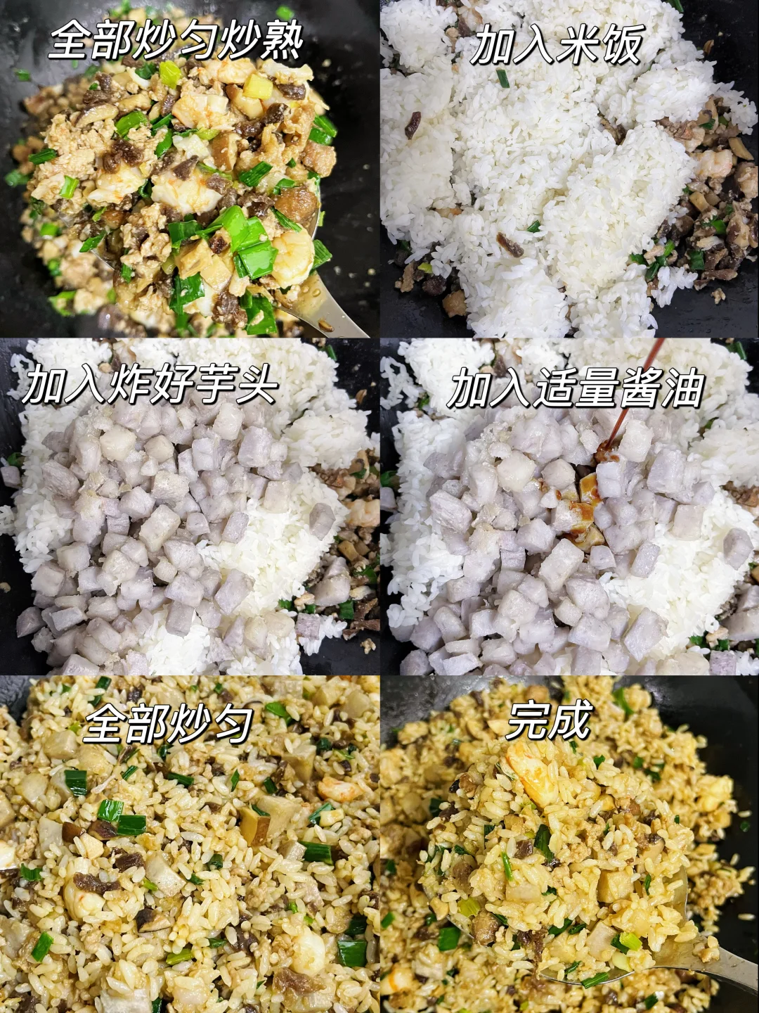 3️⃣撒蒜苗再翻几下,再加入米饭和炸过的芋头块,淋一圈酱油,大火翻炒均匀炒到米粒油亮干爽就可以出锅啦。