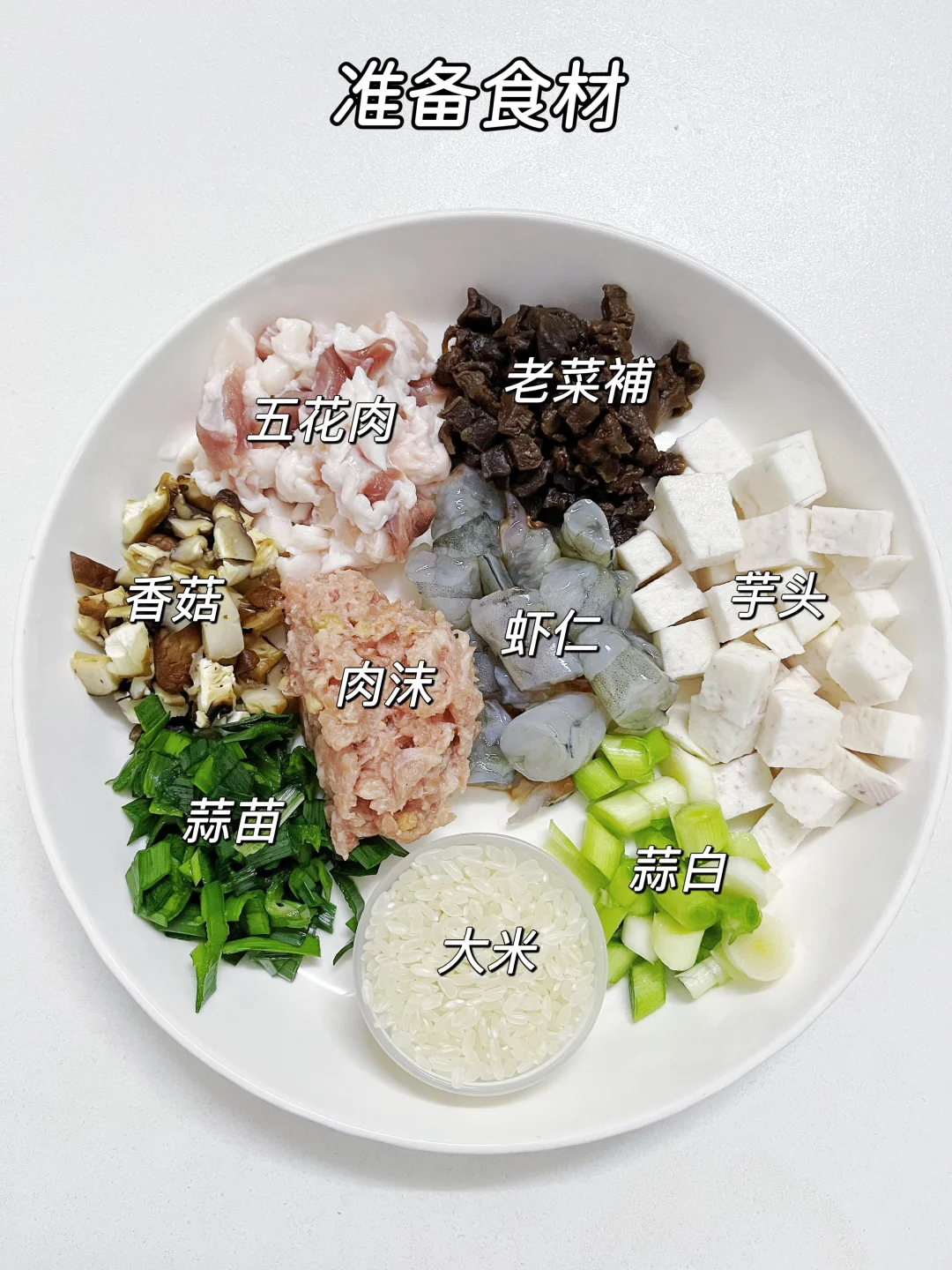 五花肉、老菜脯、香菇、虾仁、芋头、肉沫、蒜苗、蒜白、大米