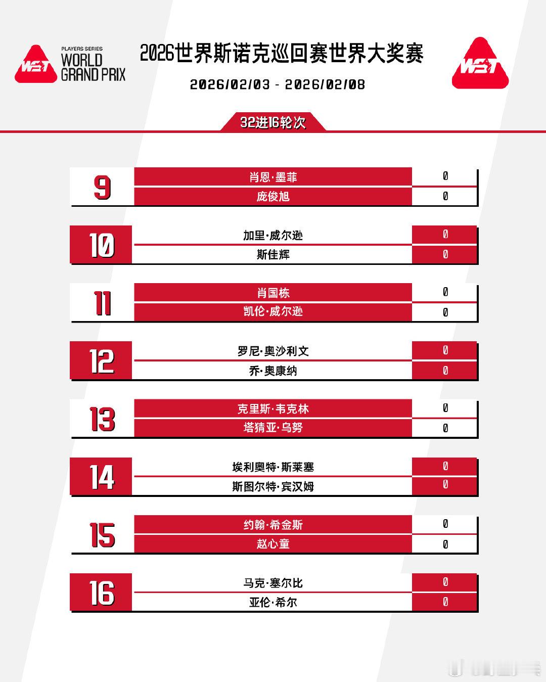 中国10人出战斯诺克世界大奖赛 斯诺克世界大奖赛将于明年2月3日至8日举行,赛季前32名选手齐聚香港本届赛事共10名中国选手参赛,首轮对阵如下周跃龙vs马奎尔袁思俊vs特鲁姆普 吴宜泽vs麦克吉尔常冰玉vs利索夫斯基丁俊晖vs巴里霍金斯张安达vs威廉姆斯庞俊旭vs墨菲斯佳辉vs加里·威尔逊肖国栋vs凯伦·威尔逊赵心童vs希金斯2026斯诺克世界大奖赛
