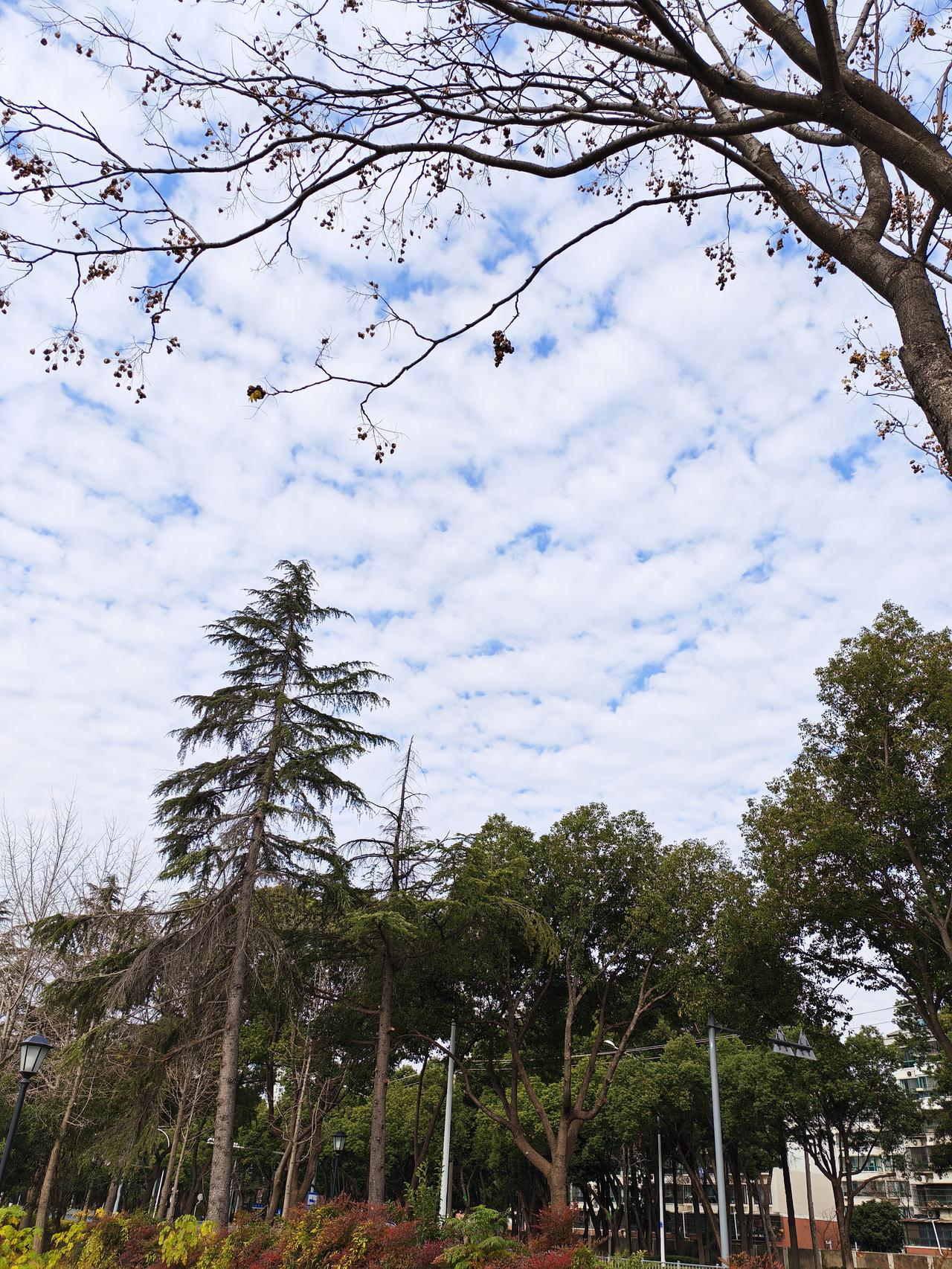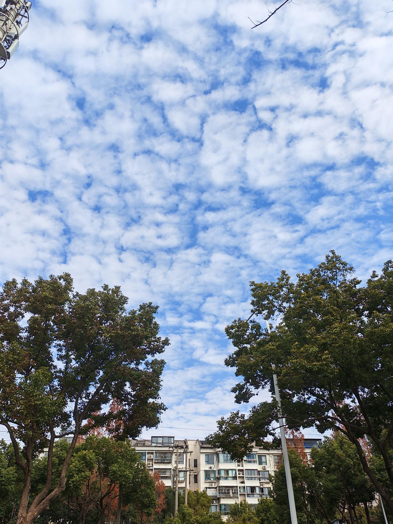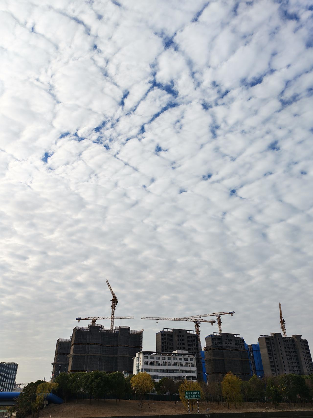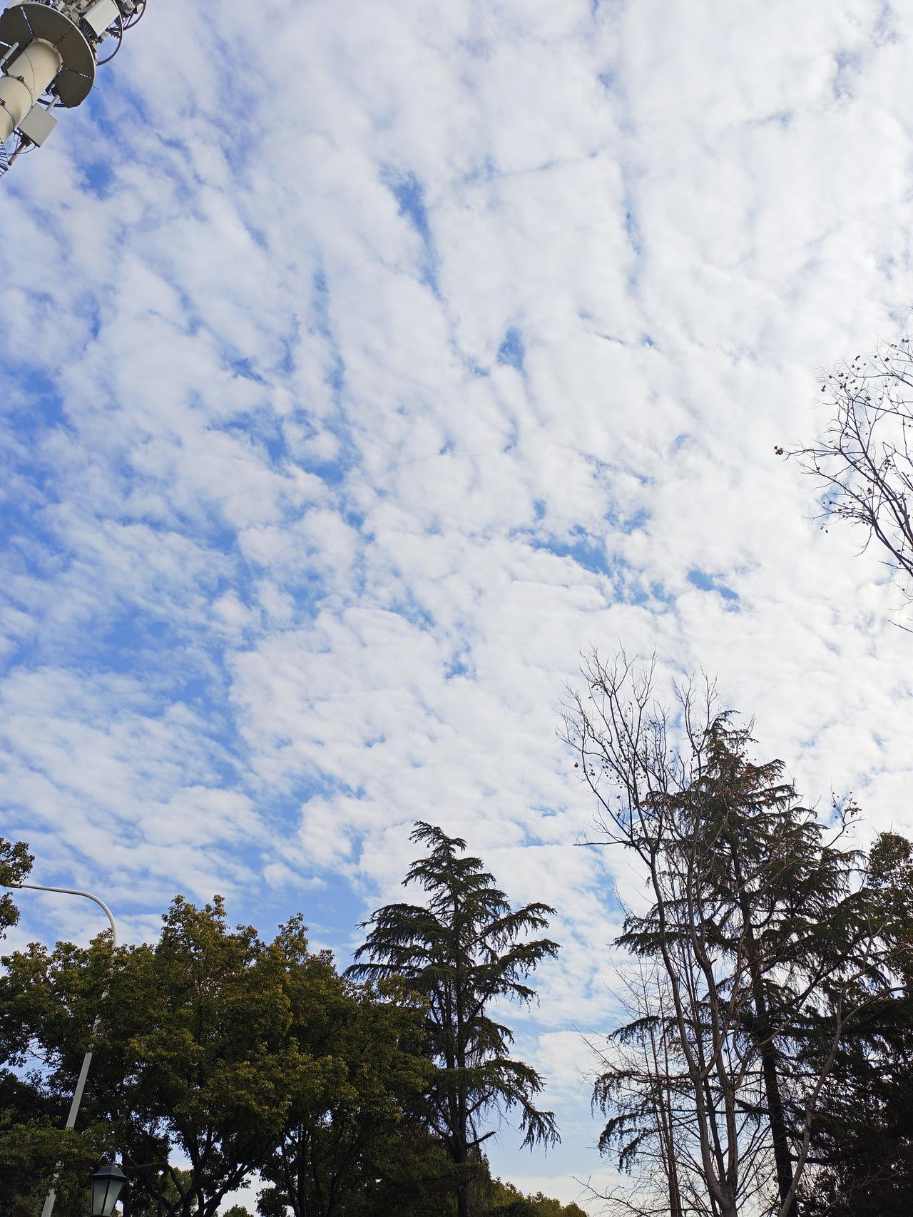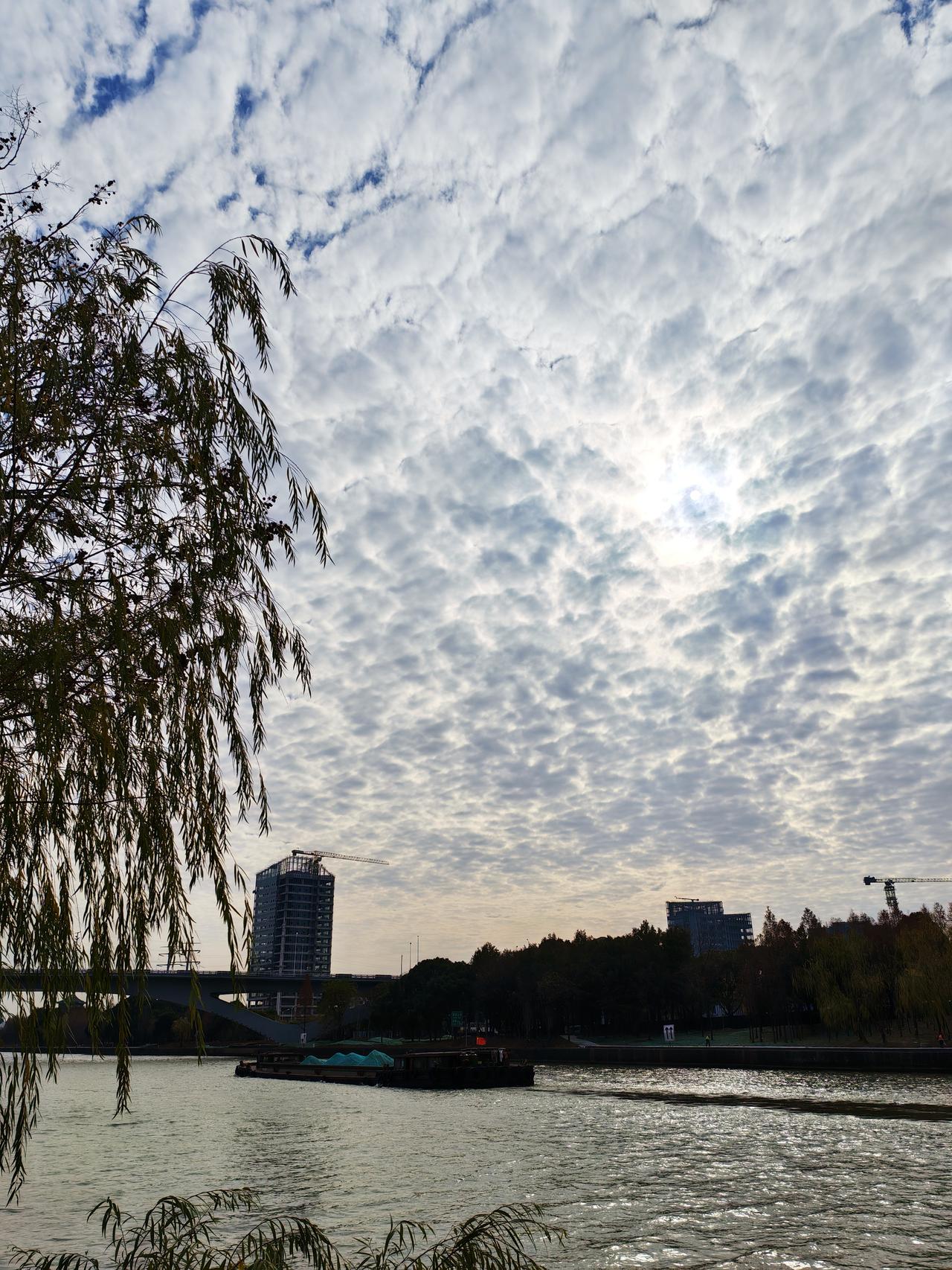 今天早饭后,又照常走出家门到京杭大运河岸边来散步,由于冬至已过,已经实至名归地进入了严冬了。 今天天气浮云蔽日,加之小风嗖嗖,让人有些不寒而栗。不经意间抬头望向天空,一下被异常的天空景象惊艳到了,蓝天被大量的疙瘩云罩个严严实实,连一向以火辣酷热、光芒四射著称的太阳公公都无法光照到地面上了,只能乖乖地躲在云层后边,和人类玩起了"躲猫猫",只能时不时地在云朵的间隙中瞬间露出个小脸,怪不得让人浑身上下都有冷感。 但不管怎么说,尽管如此,签者还是对天上朵朵白云的迹象深深吸引,并且边看边沉浸在万般凝思之中,浮想联翩、回味无穷,从而更加羡慕天公的魄力和魅力。 同时随手拍下的几幅图片,现在分享给条友,以期共享心情愉悦。