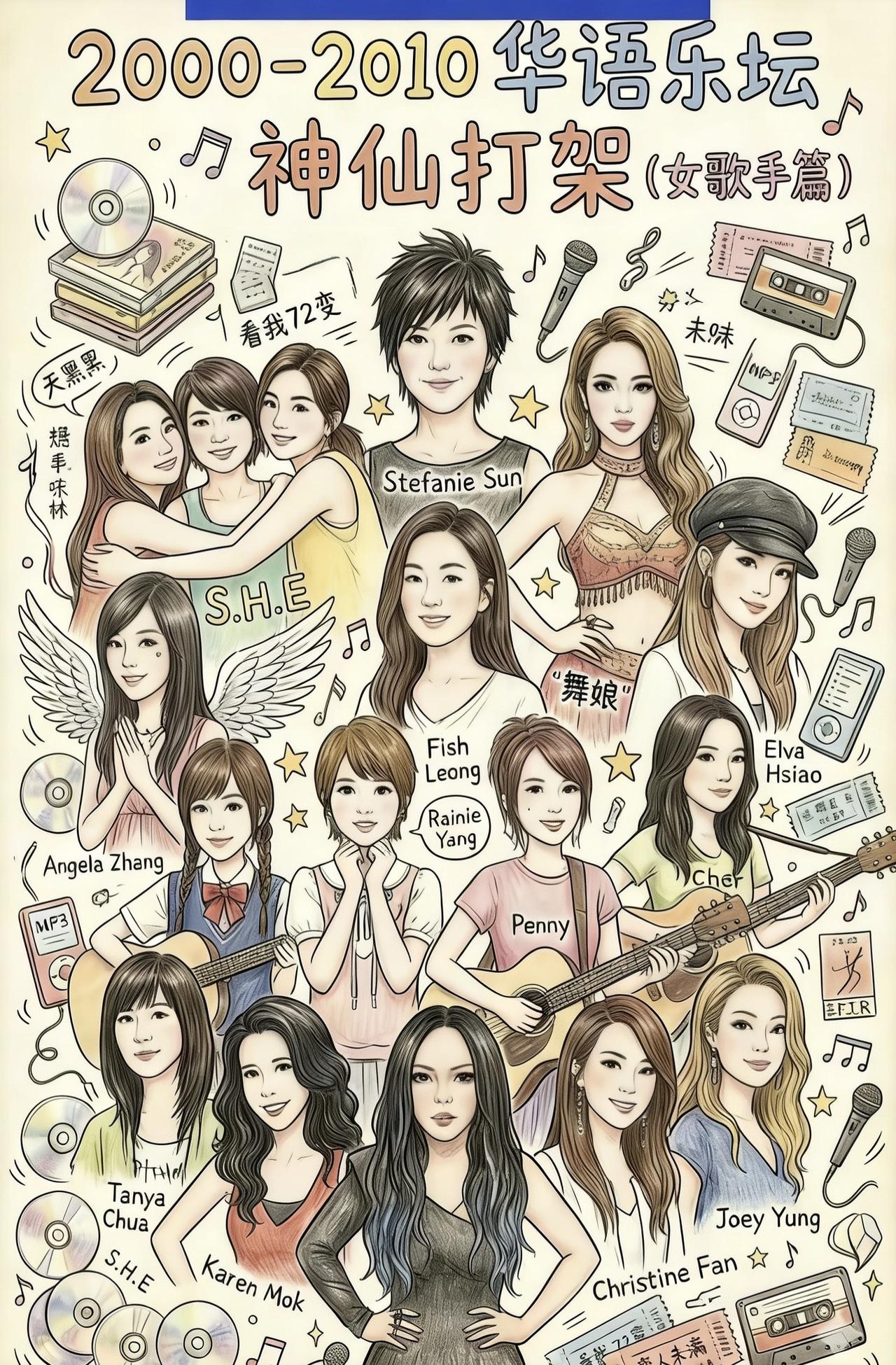 2000—2010年是华语乐坛最后的黄金时代,这期间涌现出一大批时至今日依旧处于一线的歌星。其中有出道赶上好时候的中生代女歌手,也有从90年代持续走红的老一辈天后。比如: 一、中生代女歌手: 1,音乐精灵孙燕姿 2,一代舞娘蔡依林 3,女子天团SHE 4,潇洒小姐萧亚轩 5,情歌天后梁静茹 6,电眼娃娃张韶涵 7,甜心教主王心凌 8,可爱教主杨丞琳 9,金曲甄嬛蔡健雅 10,歌坛才女戴佩妮 二、老一辈天后: 1,演唱会女王张惠妹 2,性感天后莫文蔚 3,不老天后林忆莲 …… 大家最喜欢哪一位?欢迎评论区留言。