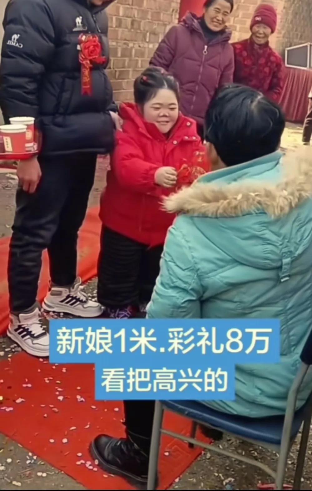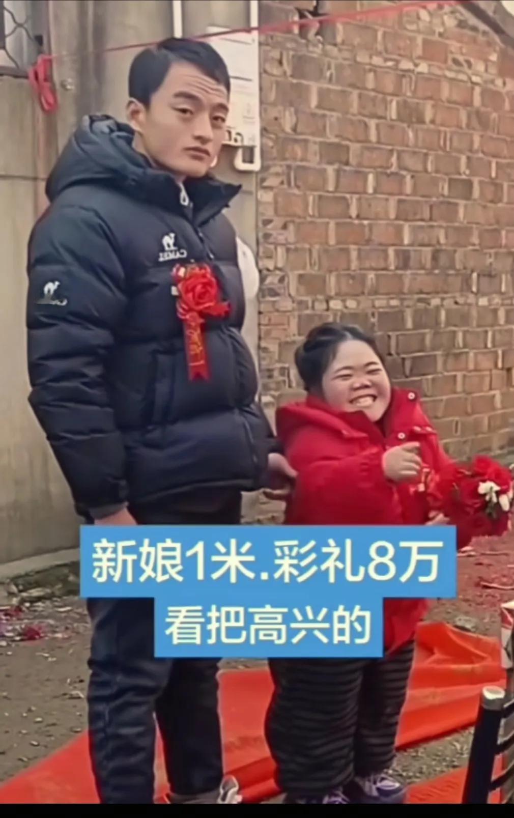 新娘身高只有一米,新郎170的个头,长相帅气,彩礼给了8万8。 新郎还是个暖男,新娘下婚车的时候,走路不稳当,他都扶着,站那里也是时刻都用一只手扶着新娘。 新娘长得也很可爱,笑容满面,嫁给自己喜欢的人,从内心散发出幸福的喜悦。