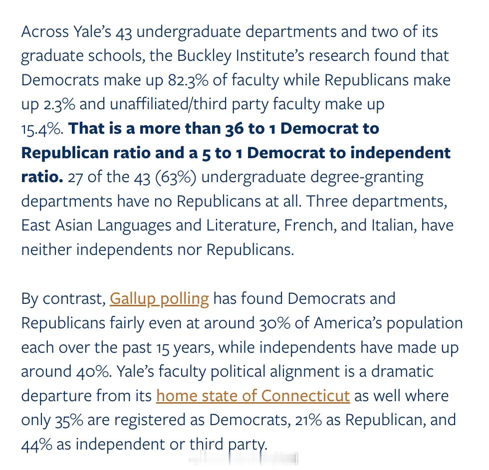 Buckley Institute最近发布的一份报告指出,耶鲁大学的43个本科院系中,有27个院系的教师队伍里没有一名共和党人。Buckley Institute创始人Lauren Noble在一份声明中表示:“连续第三年,我们的研究都显示,耶鲁教师群体在政治和意识形态上存在明显失衡。”她说:“几十年来,耶鲁一再承诺要营造一个鼓励公开辩论和讨论的学术环境,但在实际的招聘过程中,却几乎把不同观点排除在外。”“当耶鲁校园与整个国家在意识形态上出现如此巨大的鸿沟时,也就不难理解,公众为何对高等教育的信任度如此之低。”这份报告考察了耶鲁的本科院系,以及管理学院和法学院的师资情况。报告发现,接近83%的教师登记为民主党人,或主要支持民主党候选人。超过15%的教师自认是独立人士,而共和党人所占比例不足3%。海外新鲜事今日焦点