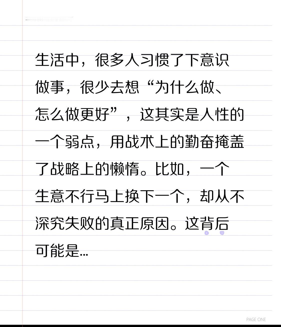 生活中,很多人习惯了下意识做事,很少去想“为什么做、怎么做更好”,这其实是人性的一个弱点,用战术上的勤奋掩盖了战略上的懒惰。比如,一个生意不行马上换下一个,却从不深究失败的真正原因。这背后可能是因为: 怕麻烦:深入思考费神费力,不如直接行动来得痛快。 习惯使然:长期依赖别人给答案,比如家长替孩子包办一切,反而让孩子失去了独立思考的机会。