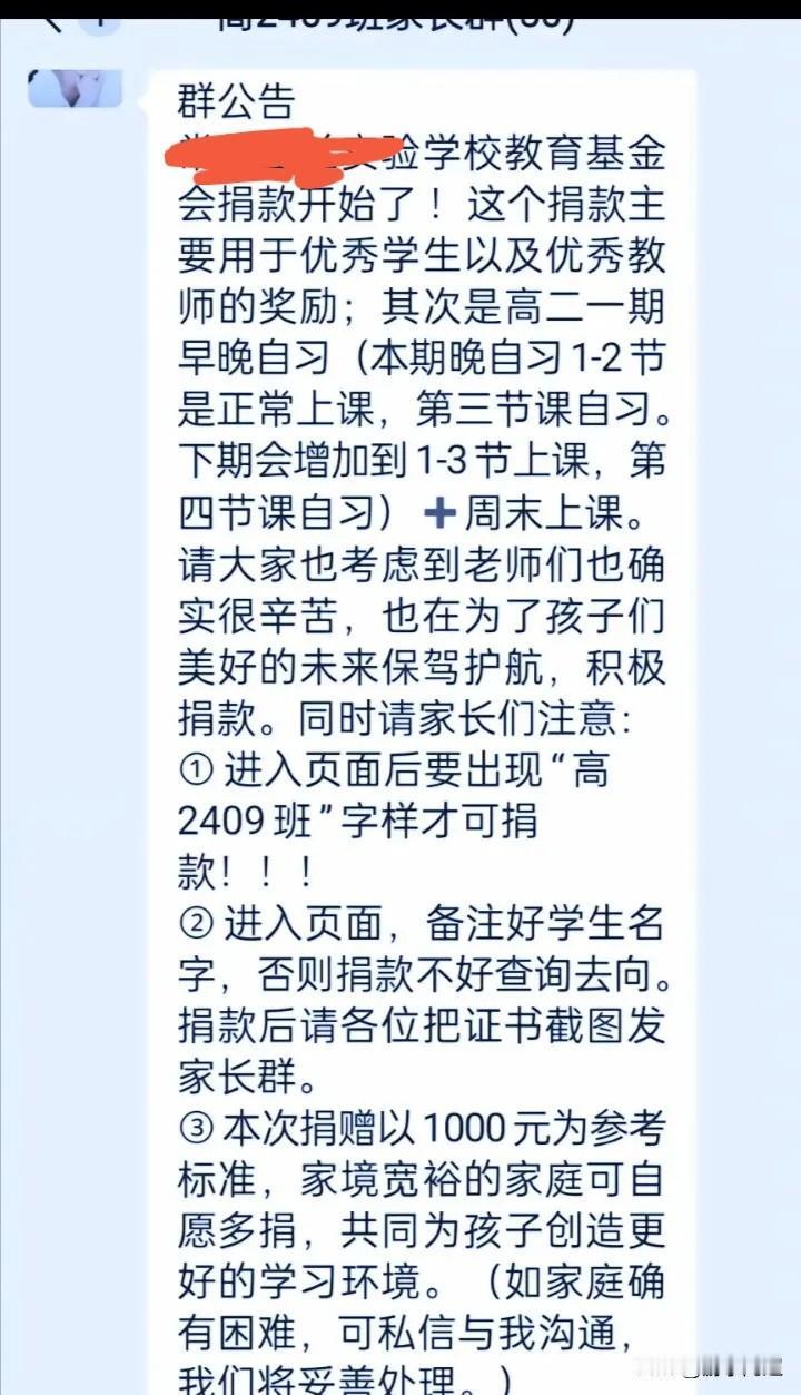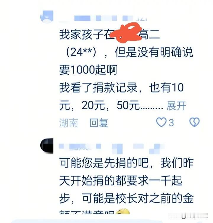 湖南常德市一所公办高中号召家长捐款,以1000元为参考标准,此举遭到家长质疑。