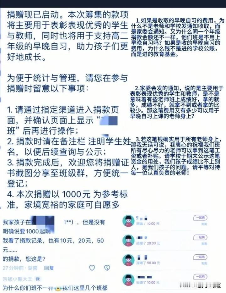 湖南常德市一所公办高中号召家长捐款,以1000元为参考标准,此举遭到家长质疑。 这所学校的高考成绩在整个湖南省都很有名气。 从学校发布的信息来看,成立教育基金进行捐款,目的是奖励优秀教师和学生,以及支付高中老师早、晚自习的费用。 其实这种捐款也能理解,不少学校的高中老师会利用自习课时间给学生授课,1000元也不算多,相较于学生在外面补课几百元每小时的费用,也就相当于几节课的花销。 实际上,家长主要质疑的是学校成立的基金会不够健全,筹款目的繁杂且含糊不清。而且同一年级的捐款要求存在差异,这自然会引起家长的反感。 还有“1000元为参考目标,家境富裕可多捐……”这样的表述,捐款只有下限,没有上限,着实让人难以接受。