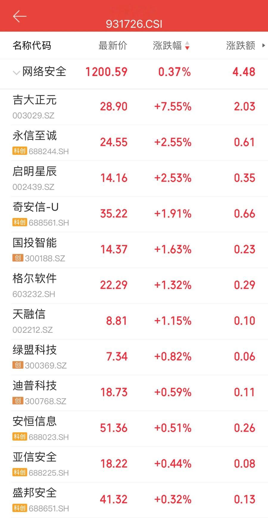 12月23日,A股网络安全板块迎来显著异动,板块集体高开走强,多只核心个股同步拉升。截至9时52分,吉大正元涨幅达7.55%,永信之诚涨幅2.55%,奇安信、绿盟科技、亚信安全、盛邦安全等个股均出现不同程度跟涨行情。