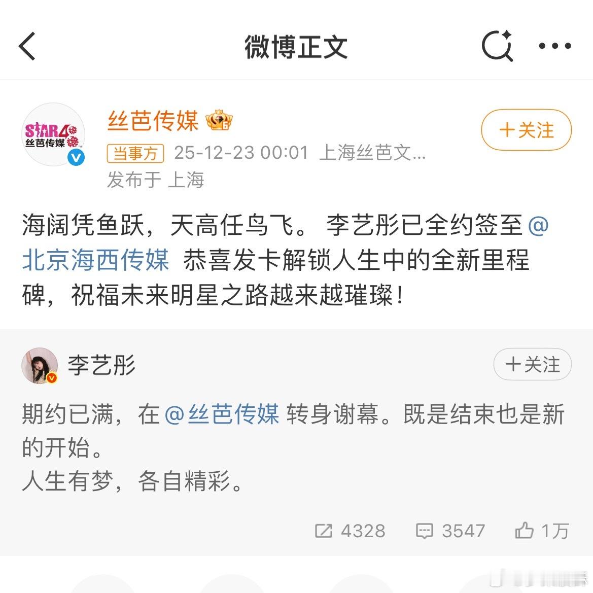 李艺彤官宣离开丝芭李艺彤与丝芭传媒和平解约较罕见,双方体面道别,堪称内娱解约范本