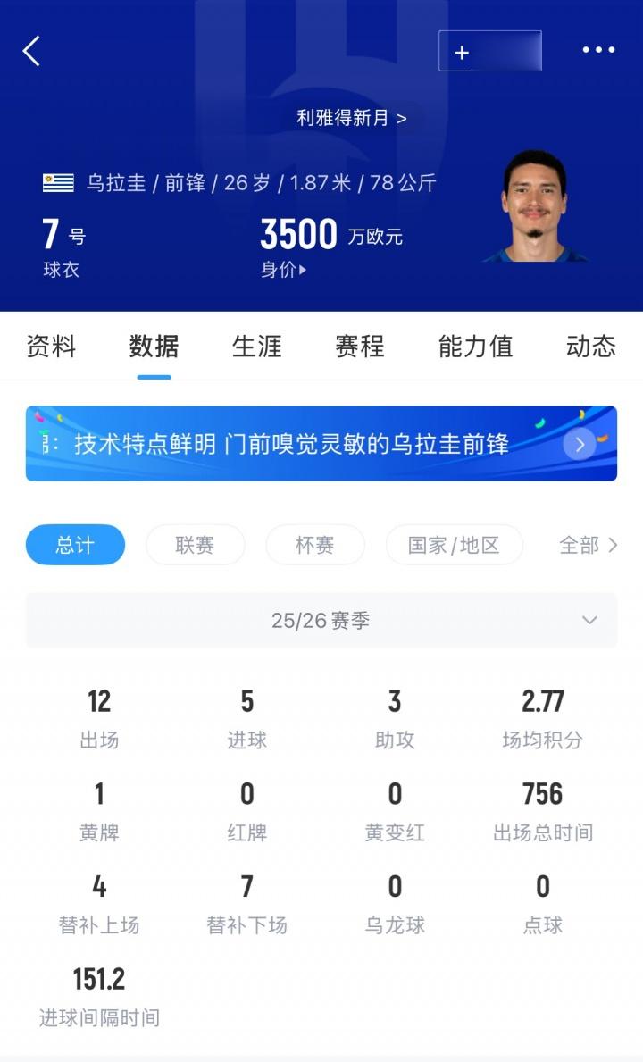 26岁的努涅斯今夏从利物浦转会新月,转会费5300万欧。加盟至今努涅斯沙特联6场4球2助,亚冠精英4场1球1助,算上沙王冠各项赛事12场5球3助。