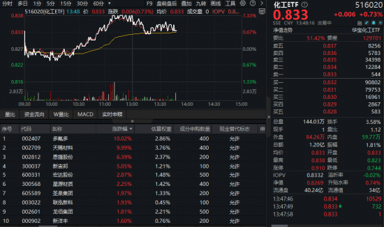 成份股方面,氟化工、锂电等板块部分个股涨幅居前。截至发稿,多氟多、天赐材料双双涨停,恩捷股份大涨超6%,新宙邦涨超5%,宏达股份、星源材质涨超2%。