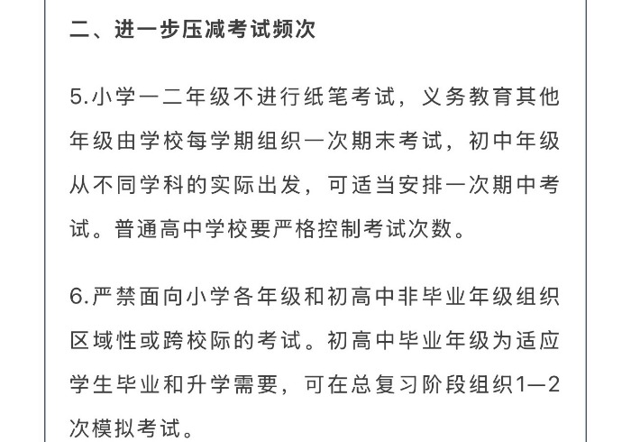 此次新规对考试次数作出明确“减量”要求:小学一二年级将全面取消纸笔考试;义务教育阶段其他年级每学期仅允许组织一次期末考试,初中可根据学科教学需要增设一次期中考试,高中阶段考试次数也将严格管控。此前普遍存在的“周测”“月考”,以及跨校、区域性统一考试均被明令禁止。即便针对初三、高三毕业年级学生,学校组织的模拟考试次数也不得超过1-2次,从制度上遏制考试泛滥现象。