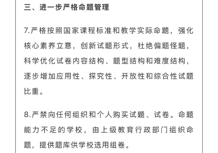 在考试内容改革方面,新规强调摒弃偏题、怪题,命题必须严格依据课本和课程标准,聚焦核心素养与实际应用能力考查。未来试题将增加探究性、开放性题型占比,引导学生动手解决实际问题、主动表达独立思考,实现“易而不死、活而不难”的考查目标,让考试真正服务于知识掌握与能力提升。