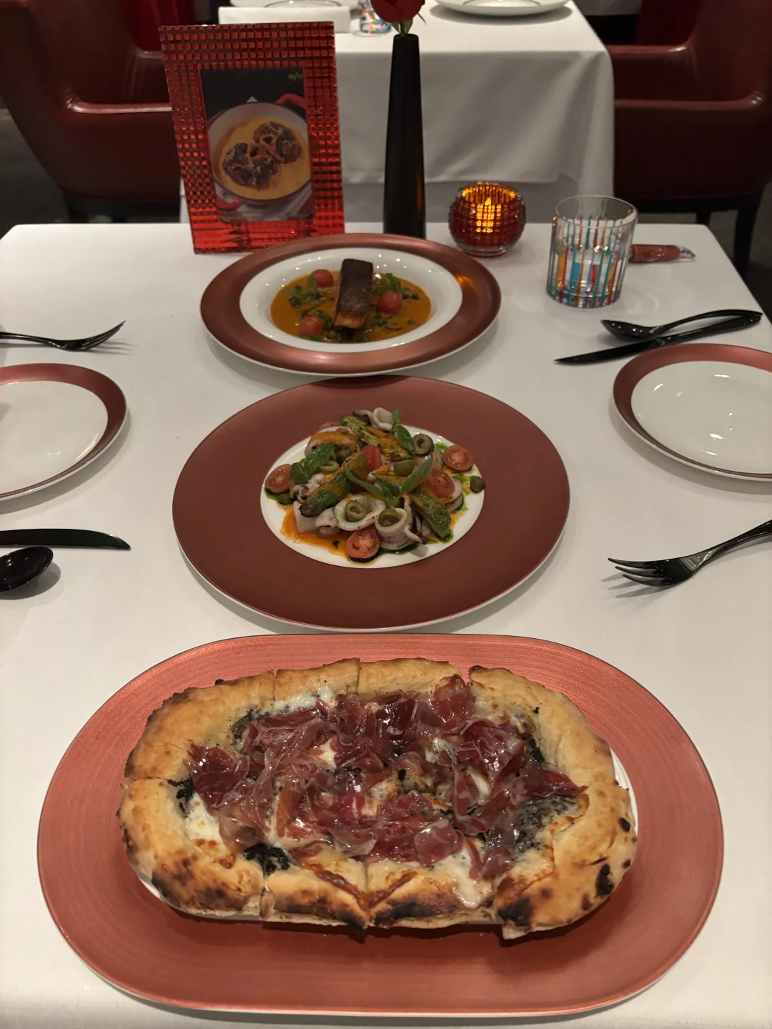 终于来打卡北京Bosco了 赶在圣诞节这个浪漫的节点🎄 不愧是TRB旗下的意大利餐厅 服务和审美一直都在线 圣诞节的气息具象化了🕯️ 黑松露火腿Pizza🍕饼底烤得恰到好处 焦香酥脆 黑松露的香气很浓郁 趁热吃 真的香迷糊 Beef Carpaccio 也是惊喜✨ 肉质鲜嫩 入口即化 卷着芝麻菜和芝士碎一口吃掉 清爽又开胃🥩 餐前面包依旧是那个熟悉的味道🥖 热乎乎的 还能无限续加 在冬天的晚上 碳水带来的快乐最直接 祝大家圣诞快乐呀🎅🎁