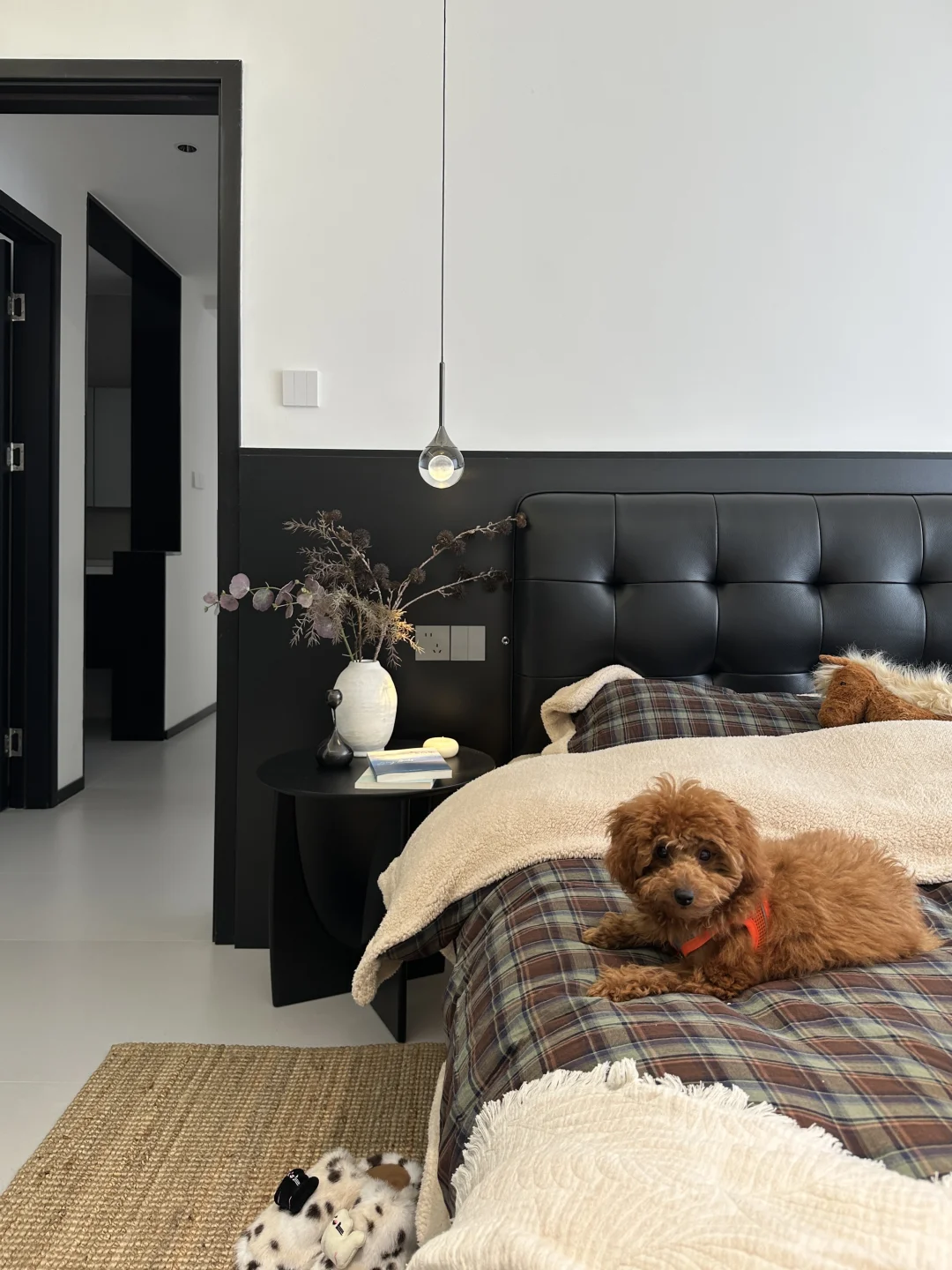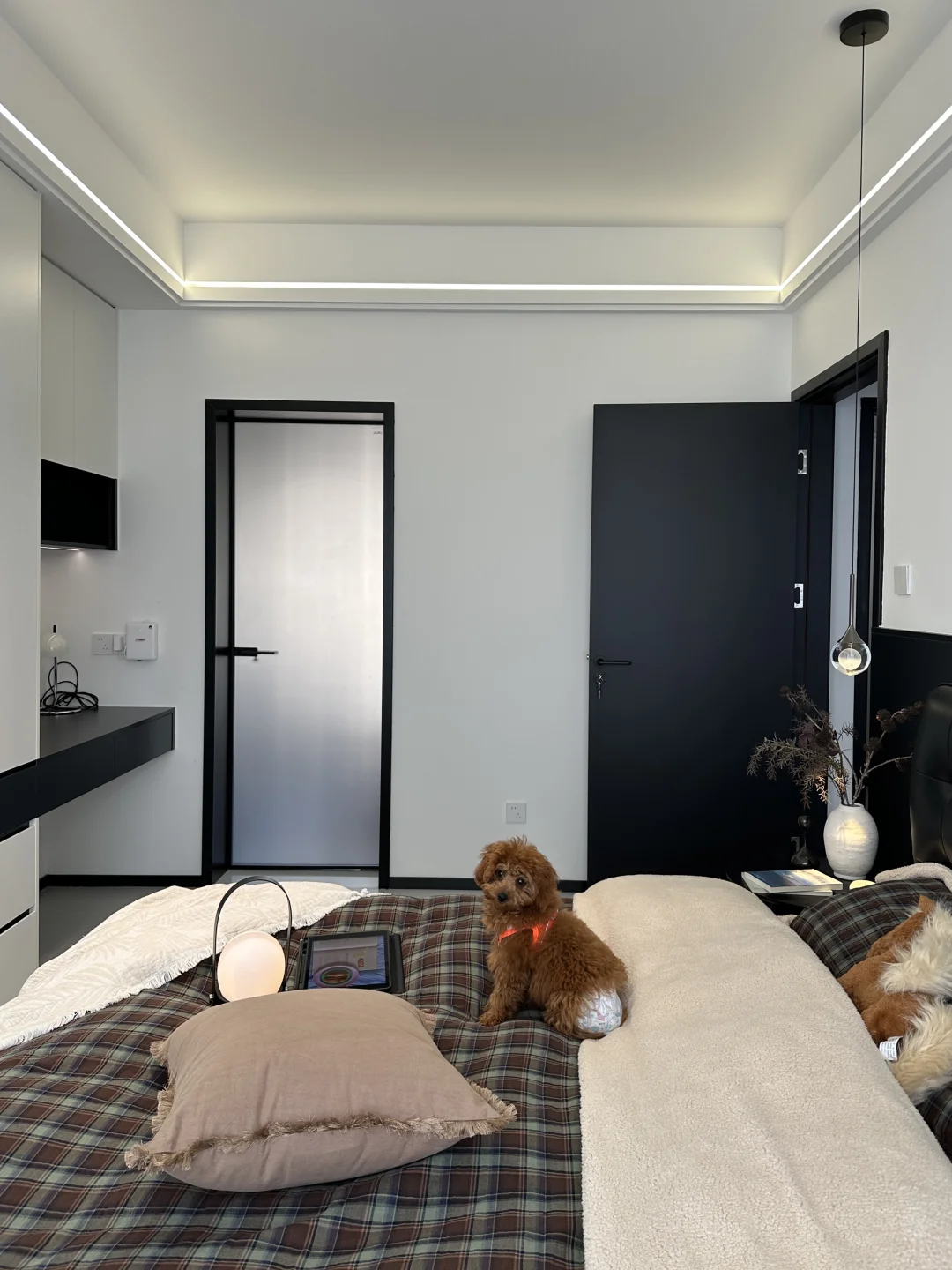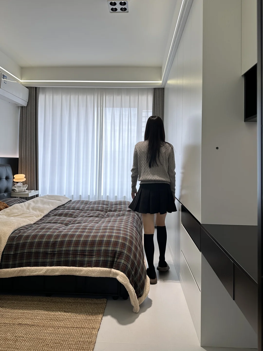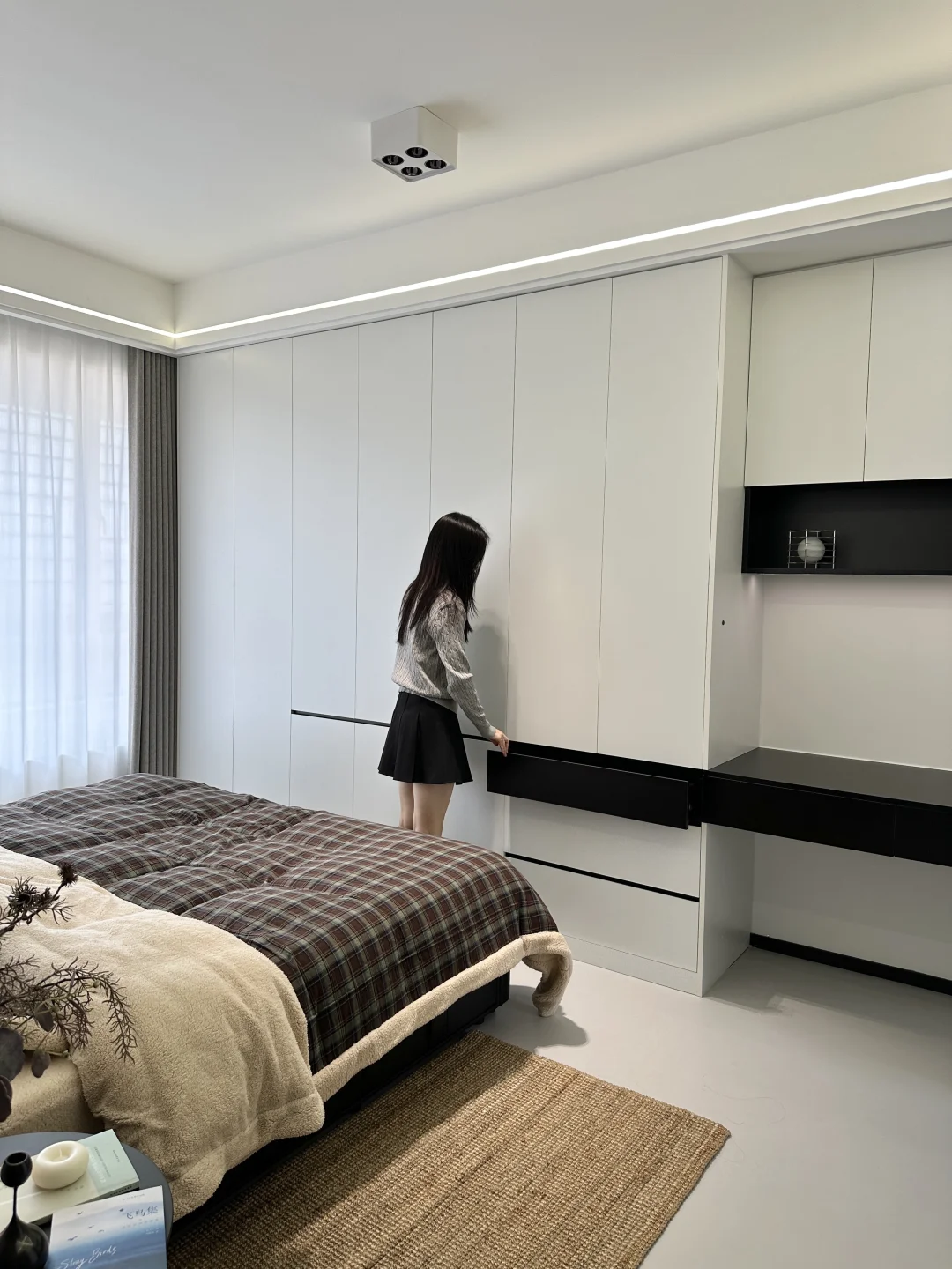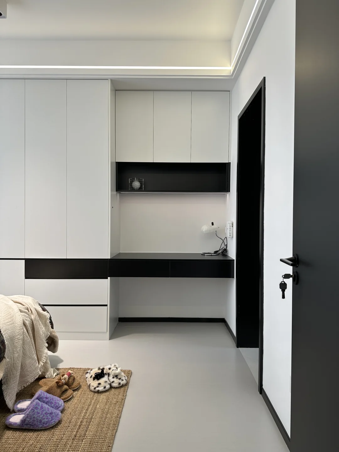 衣柜选的黑白配色,无拉手设计超简约,一点不花哨,白色为主视觉上也不压抑。梳妆台挪到卫生间旁边,活动空间更轻松~