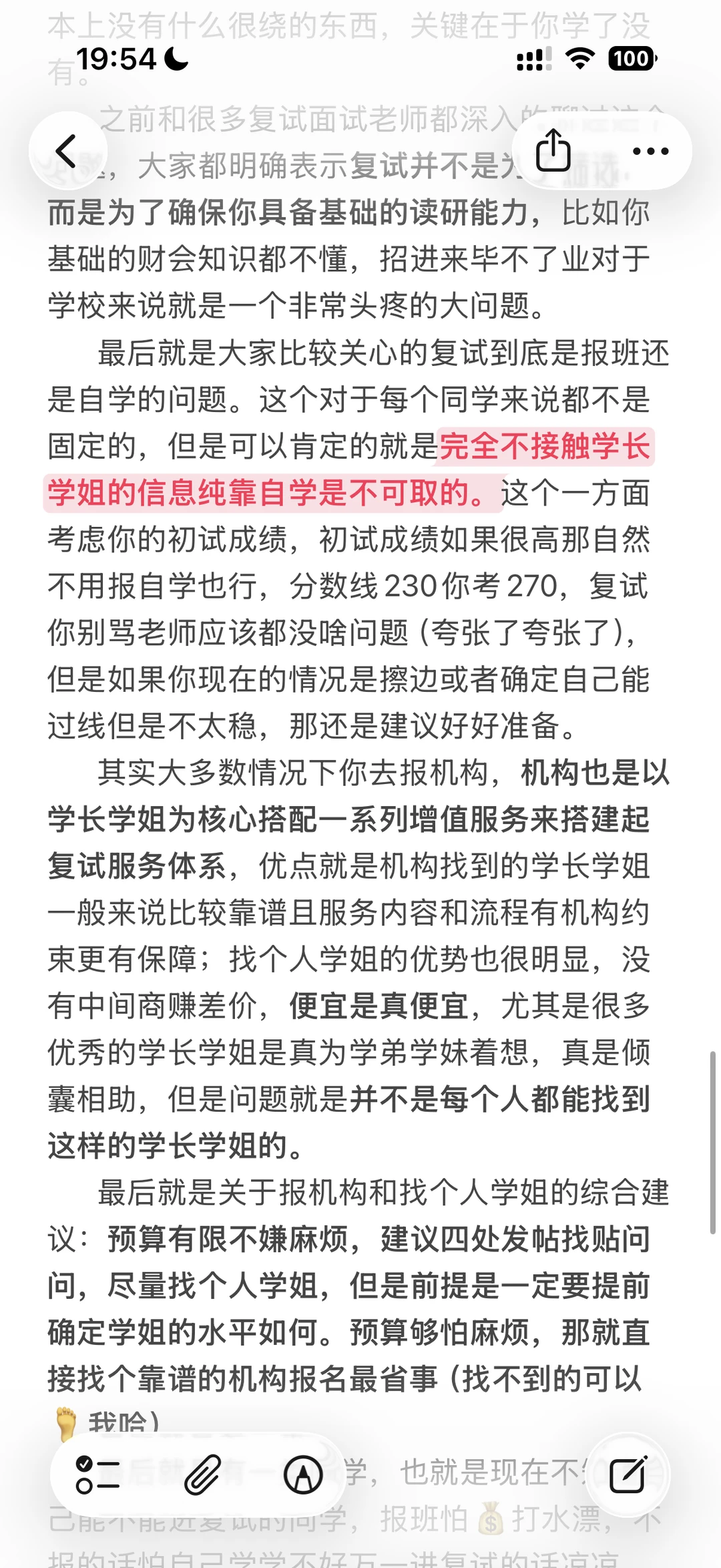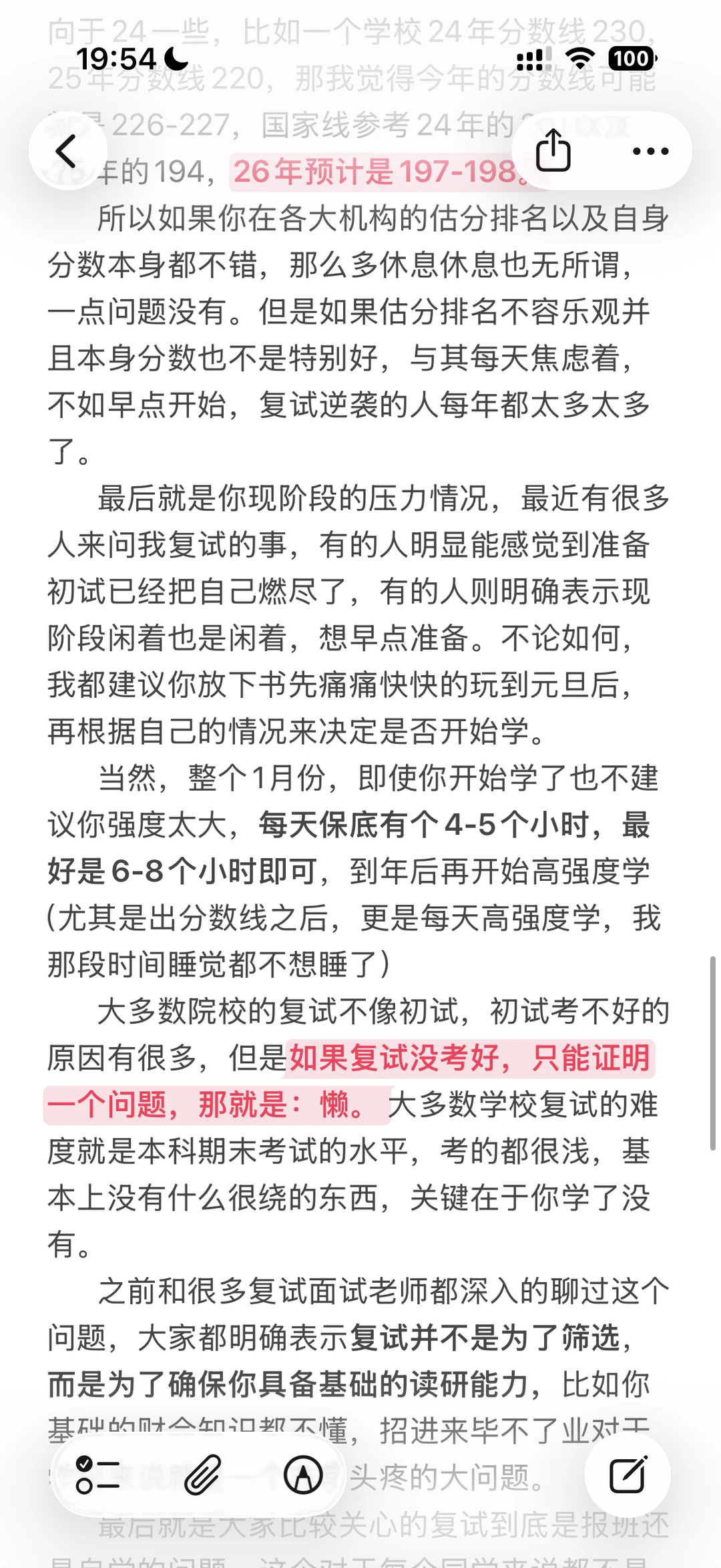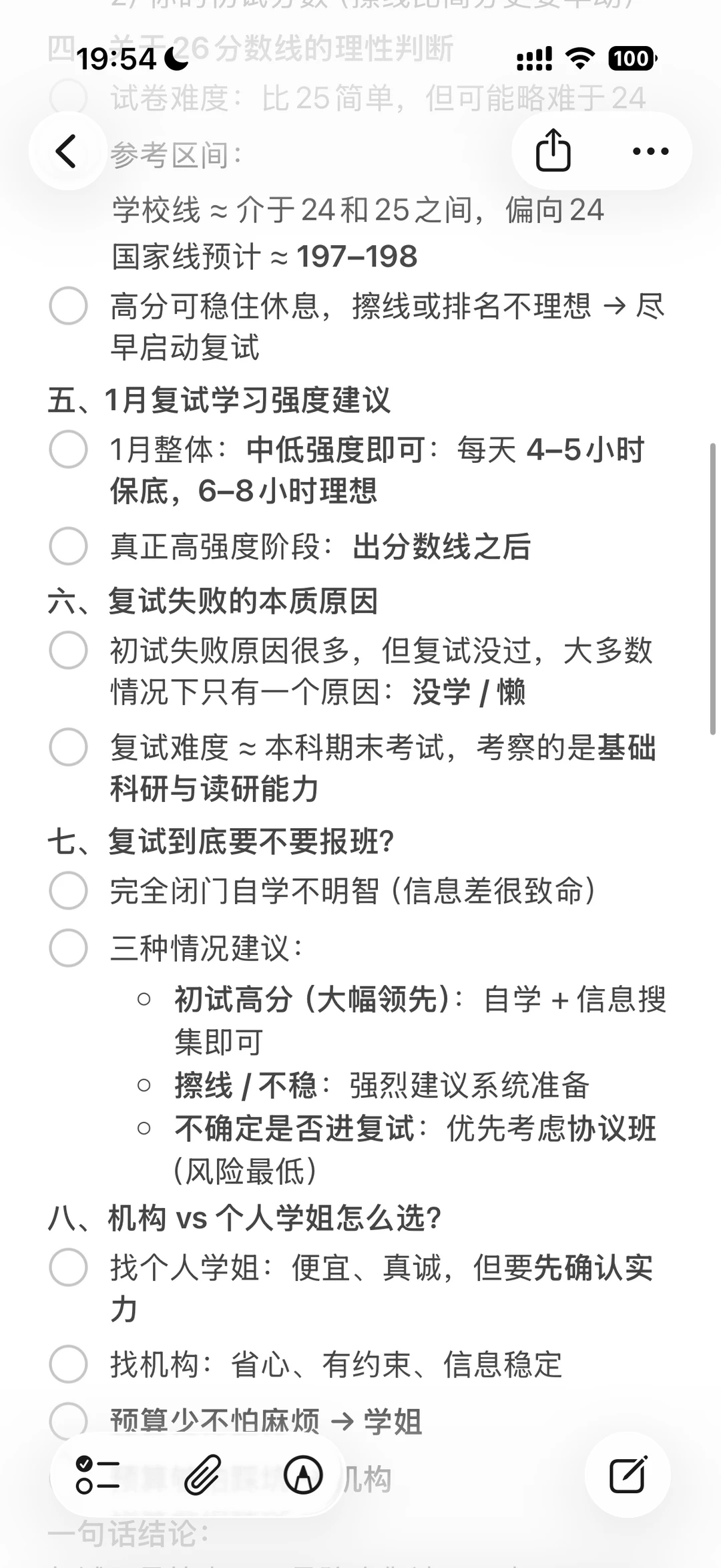 2)你的初试分数(擦线比高分更要早动) 四、关于26分数线的理性判断 - [ ] 试卷难度:比25简单,但可能略难于24 - [ ] 参考区间: 学校线 ≈ 介于24和25之间,偏向24 国家线预计 ≈ 197–198 - [ ] 高分可稳住休息,擦线或排名不理想 → 尽早启动复试 五、1月复试学习强度建议 - [ ] 1月整体:中低强度即可:每天 4–5小时保底,6–8小时理想 - [ ] 真正高强度阶段:出分数线之后 六、复试失败的本质原因 - [ ] 初试失败原因很多,但复试没过,大多数情况下只有一个原因:没学 / 懒 - [ ] 复试难度 ≈ 本科期末考试,考察的是基础科研与读研能力 七、复试到底要不要报班? - [ ] 完全闭门自学不明智(信息差很致命) - [ ] 三种情况建议: * 初试高分(大幅领先):自学 + 信息搜集即可 * 擦线 / 不稳:强烈建议系统准备 * 不确定是否进复试:优先考虑协议班(风险最低) 八、机构 vs 个人学姐怎么选? - [ ] 找个人学姐:便宜、真诚,但要先确认实力 - [ ] 找机构:省心、有约束、信息稳定 - [ ] 预算少不怕麻烦 → 学姐 - [ ] 预算够怕踩坑 → 机构 一句话结论: 复试不是筛人,而是防止你读不下去;