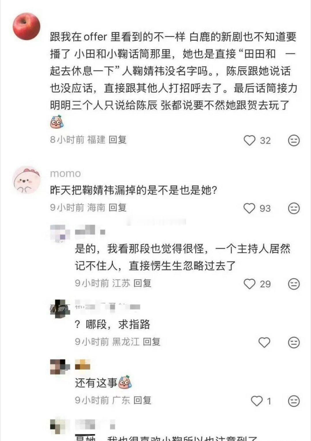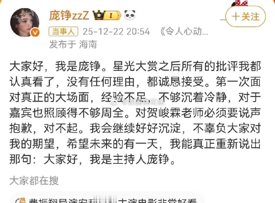 庞铮被骂真不冤!作为主持人,在星光大赏上频繁出错,结果道歉文里就只给贺峻霖道了歉,对同样被忽略、连名字都没提的鞠婧祎,还有白鹿,提都没提。所以啊,她这道歉不仅没得到网友谅解,反倒被骂得更凶了。我瞅着,庞铮不光是业务能力不行,情商和事后处理能力也差得远。出了这么大岔子,要发文道歉,要么就给所有人道,要提名字,就把自己失误漏掉的都提一遍。只提贺峻霖,对鞠婧祎、白鹿只字不提,这不就是主动给人留话柄,找着挨骂吗?