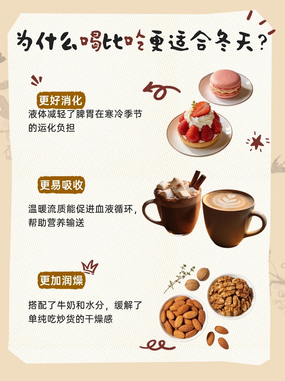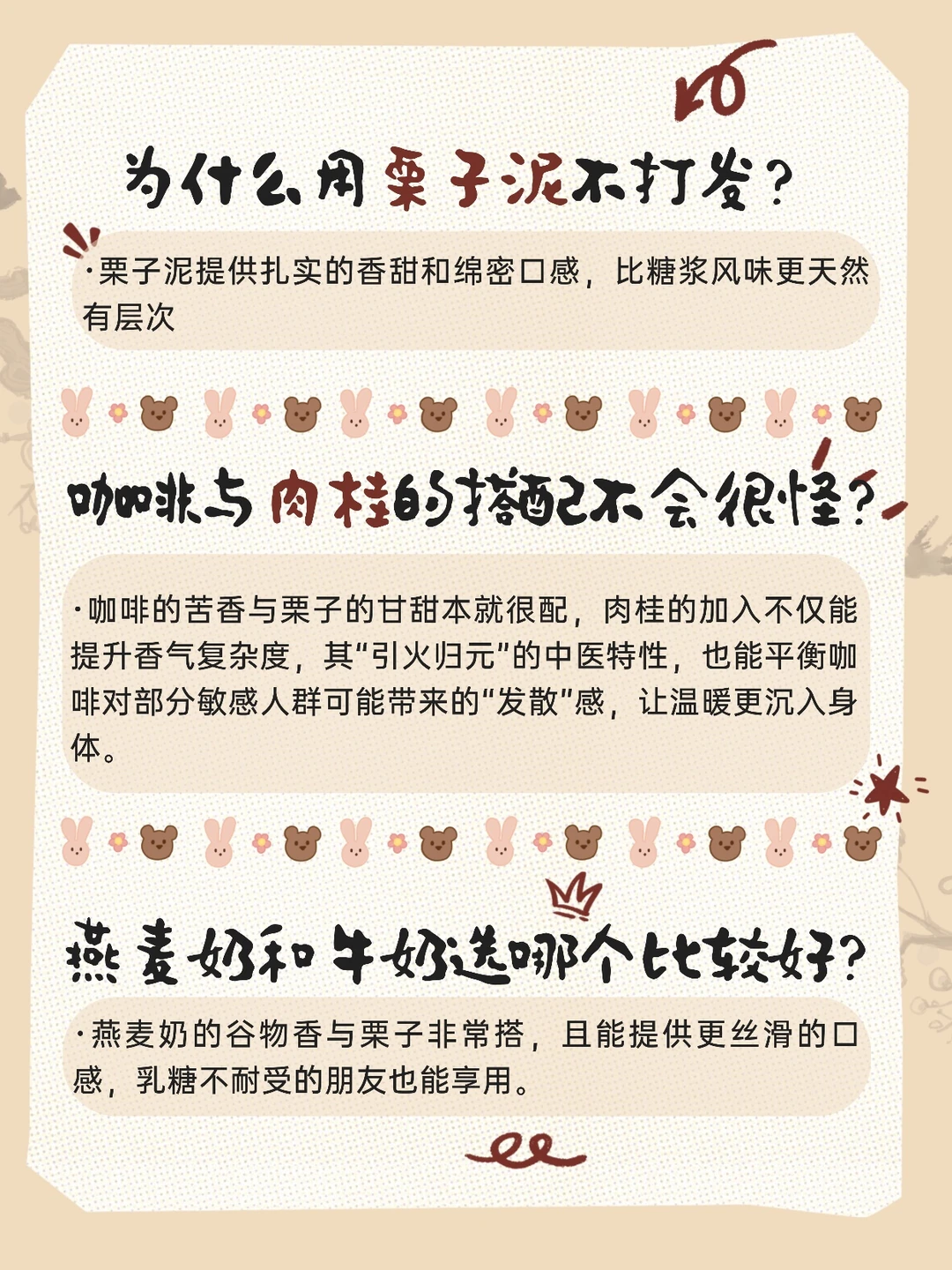 🌰冬天谁能拒绝一袋糖炒栗子? 但吃完总觉得口干上火,手上黏黏的,胃里也沉甸甸的…… 有没有一种方法,能只留下它的香甜温暖,去掉所有负担? 👐当然有!今年小美发现了它的液态吃法 !!!一杯可以捧在手里的“栗子暖抱抱”!!! 🫖把街头烟火气,变成私人的温暖仪式,从喉咙一直暖到脚尖。 把难消化的固体淀粉,转化成温润顺滑的液体能量,更好吸收,还能润燥。 🥤一杯“栗子暖抱抱”拿铁 🌰🌰灵魂栗子泥 去壳熟栗子肉100g(约一大把)、燕麦奶或牛奶50ml、零卡糖5g(可选枫糖浆) 用料理机打成无比顺滑的泥状。这是口感绵密的关键,不要有颗粒! ☕️☕️ 将美味组装 将一半栗子泥涂抹在杯壁,做出“脏脏”的挂壁效果,剩余倒入杯底 沿着杯壁缓缓倒入牛奶 最后加入适当浓缩咖啡 ✨✨味觉点睛之笔 倒入杯中,在表面撒上一小撮肉桂粉 顶部点缀几粒烤香的栗子碎 搭配上曲奇享受完美的下午茶 PS:肉桂是“引火归元”的高手,能把温暖牢牢锁在身体里,而不是让人“虚火上炎”。 栗子问答时间 为什么用栗子泥不打发? 🌰栗子泥提供扎实的香甜和绵密口感,比糖浆风味更天然有层次。 咖啡与肉桂的搭配味道不会很怪? 🧂咖啡的苦香与栗子的甘甜本就很配,肉桂的加入不仅能提升香气复杂度,其“引火归元”的中医特性,也能平衡咖啡对部分敏感人群可能带来的“发散”感,让温暖更沉入身体。 燕麦奶和牛奶选哪个比较好? 🥛燕麦奶的谷物香与栗子非常搭,且能提供更丝滑的口感,乳糖不耐受的朋友也能享用。 ☕️为什么“喝”比“吃”更适合冬天? 更好消化:液体减轻了脾胃在寒冷季节的运化负担。 更易吸收:温暖流质能促进血液循环,帮助营养输送。 更润燥:搭配了牛奶和水分,缓解了单纯吃炒货的干燥感。 🥺下次买了栗子别再吃的满手满嘴脏兮兮啦! 试试这款液态版糖炒栗子,享受新中式创意冬日热饮吧! 你还想把哪种冬季食物变成热饮?糖葫芦、烤红薯,还是… 快来评论区告诉小美吧!