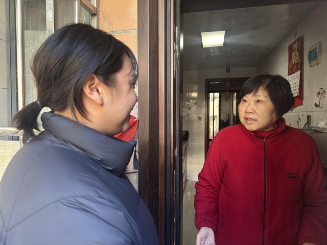 徐房物业养老服务专员(左)向田林新村老年居民了解服务情况。舒抒摄