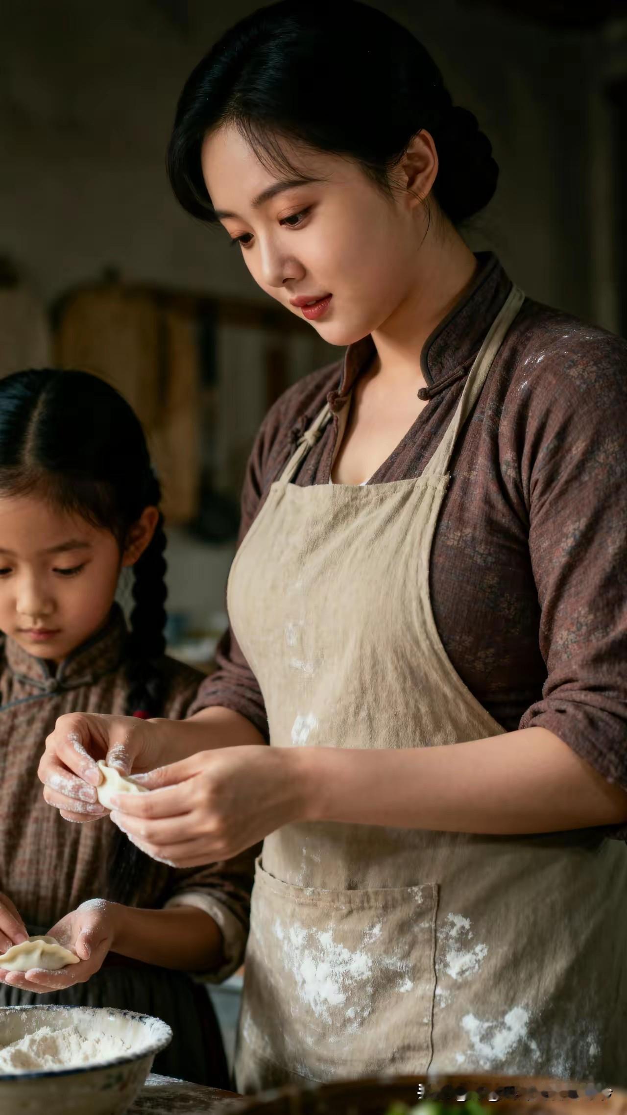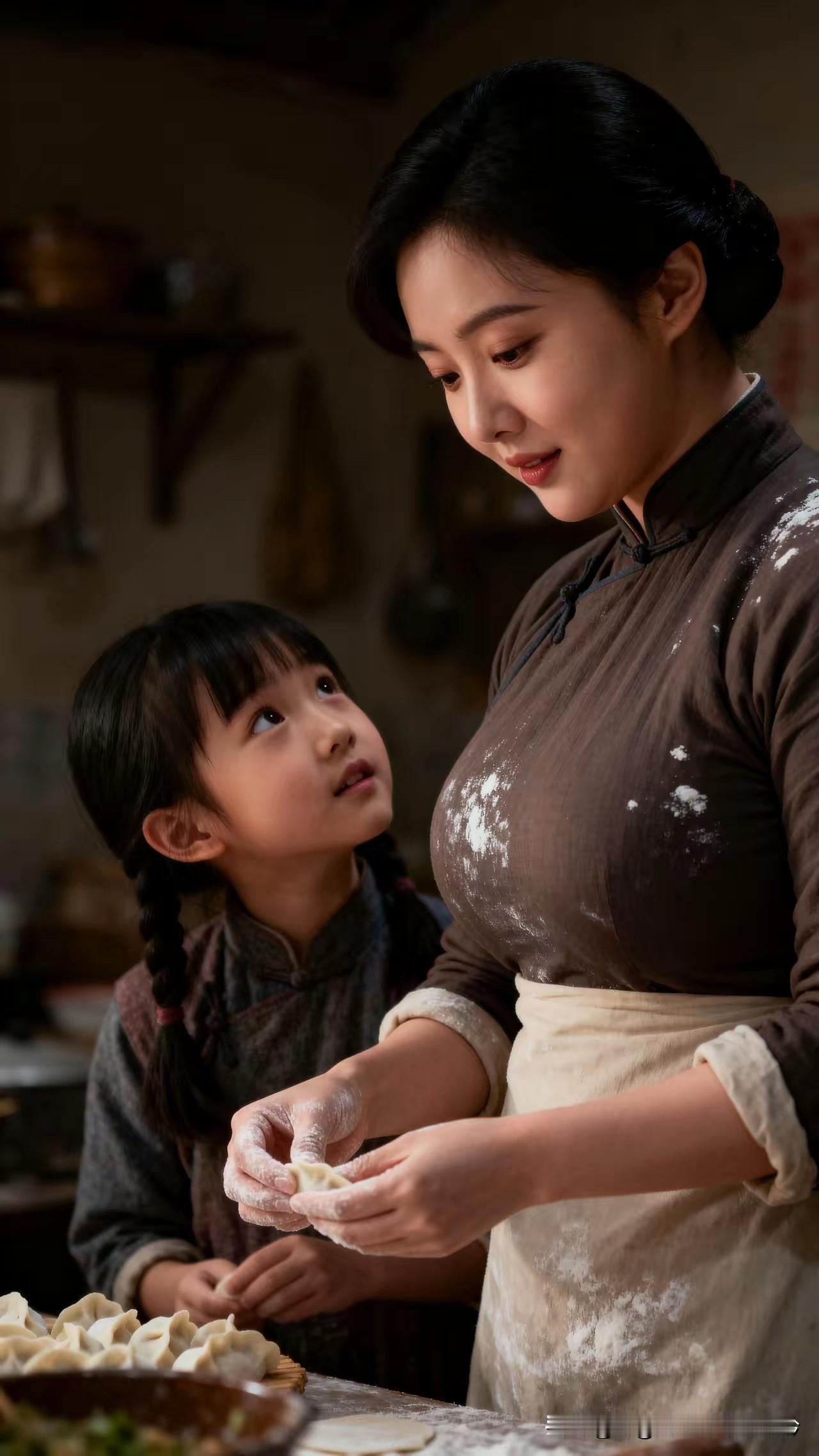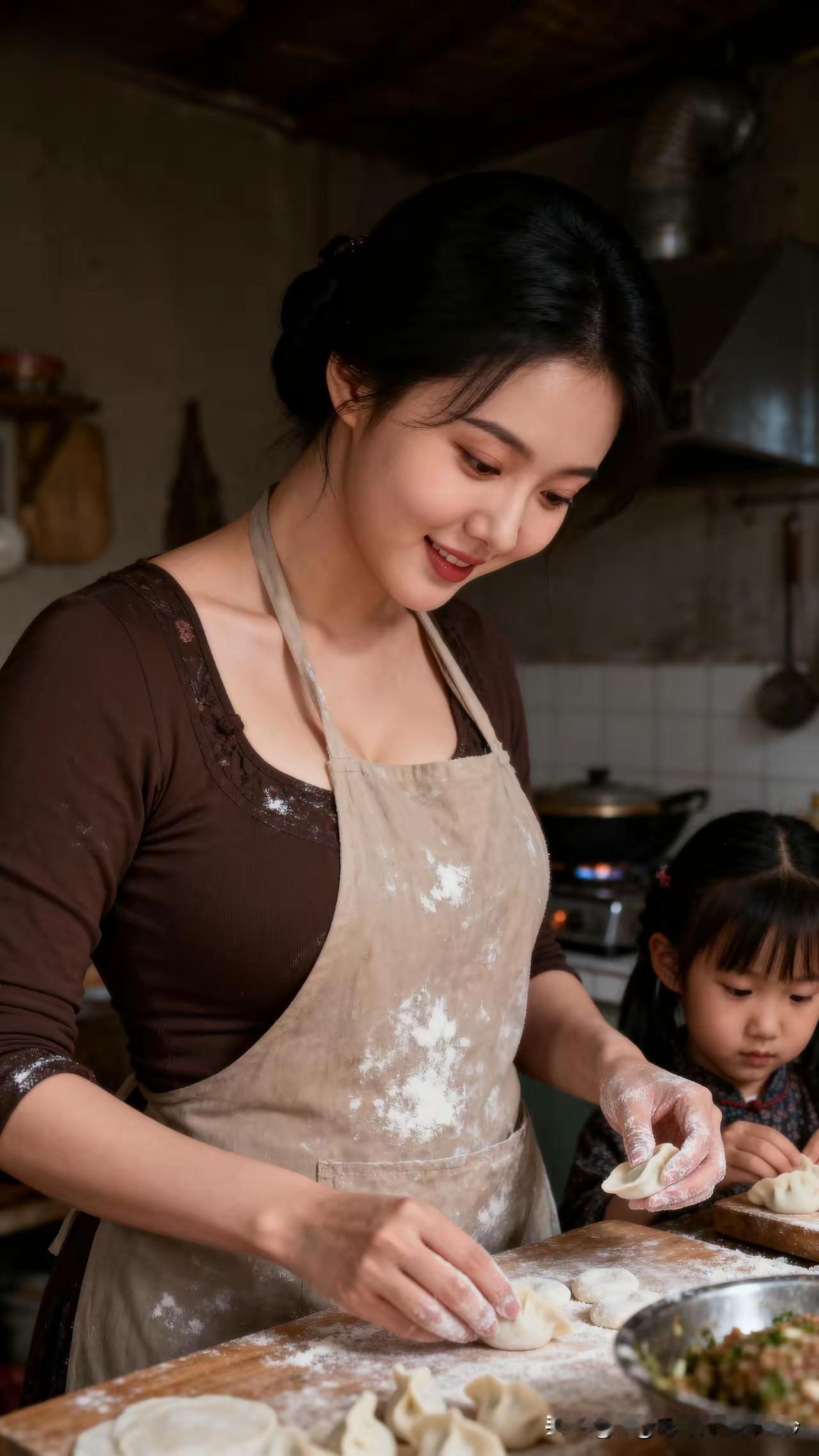 谁家的男子,能有这般福气,竟在破败不堪的环境中,娶回如此美丽的妻子和可爱的女儿! 昏黄的灯光,宛如一层薄纱,轻柔地铺洒在老屋的案板上,面粉簌簌落下,沾上衣襟。在这破旧的屋子中,生活的艰辛如影相伴。可就在这般境遇下,竟养育出一对肌肤细嫩、容貌动人的母女,着实令人称奇。 母亲带着温度的手,熟练地捏出饺子的褶子,那一道道褶痕好似岁月里的温柔刻记。小女儿扒着桌沿,有板有眼地学着,稚嫩的指尖奋力揉出团圆的模样。窗外,冬日的寒意肆意弥漫;灶上,一锅热水翻滚沸腾。 一碗冬至饺,盛着岁月里的团圆与温暖,也盛着生活的希冀。有这般贤淑的妻子,这般可爱的女儿,即便日子再贫苦又有何妨?这平凡日子里的点滴温情,便是男人心中最珍贵的珍宝,支撑着他无畏向前,去拥抱更美好的生活。