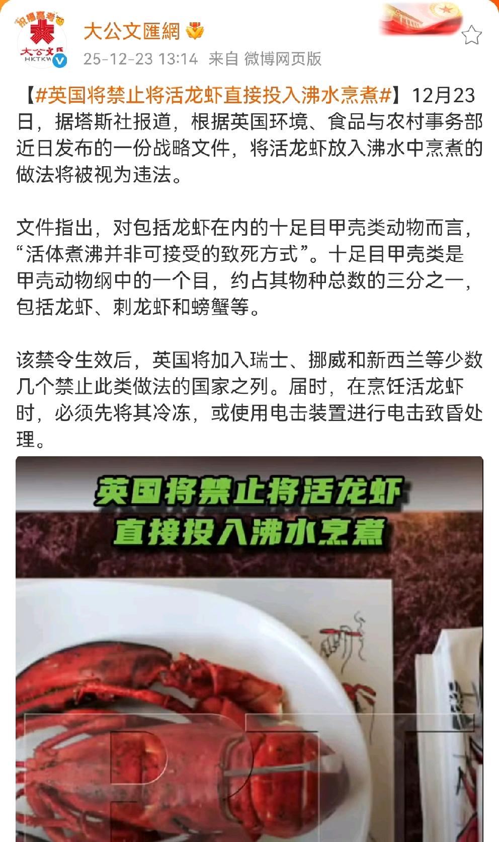 12月23号,英国发布了一份比较抽象的文件禁令。 那就是以后如果有人敢把龙虾放