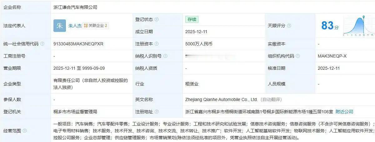 在12月18日,哪吒汽车母公司合众新能源发布关于经营管理受托方公开招募结果的公告。公告提到,共有两家意向机构提交了报名材料。而根据评审结果,遴选了其中一家意向机构作为经营管理受托方,这家意向机构正是山子高科。 根据天眼查显示,谦合汽车主要的经营范围包括汽车销售、汽车零部件零售、工业设计服务、技术服务、市场营销策划等,由上海山子有谦科技有限公司100%持股,山子有谦CEO朱人杰担任公司董事,母公司为山子高科。