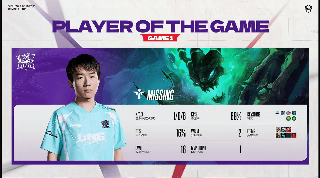 MISSING锤石打出1/0/8战绩,斩获LNG对阵WBG第一局MVP