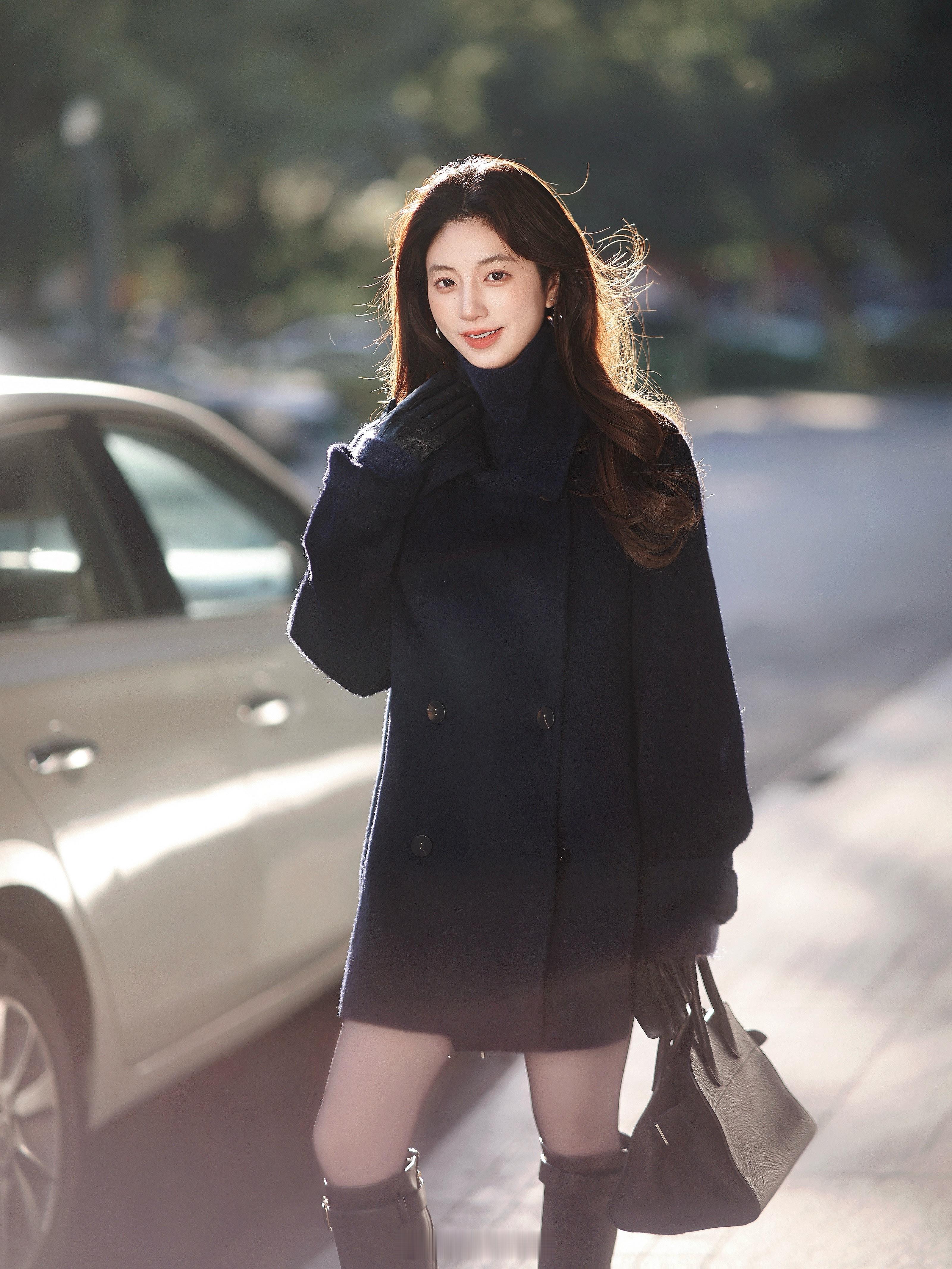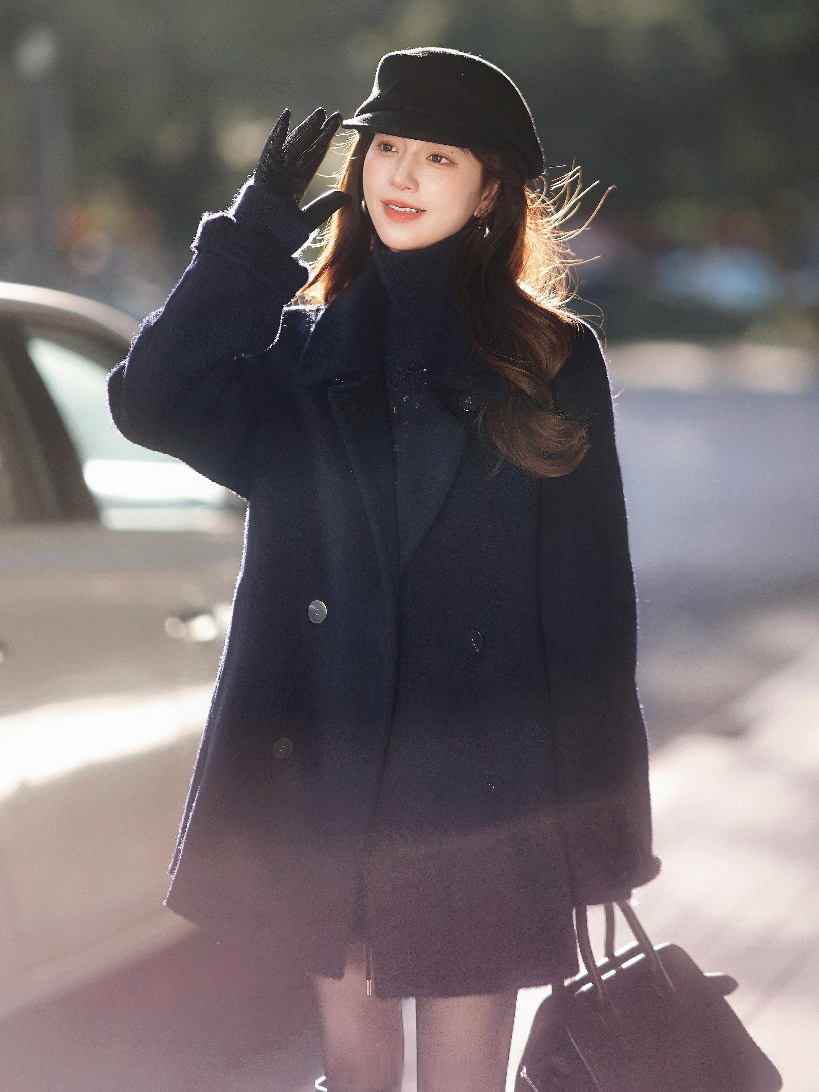 奶白毛绒大衣裹蕾丝裙,柔糯质感衬优雅,配黑丝高跟鞋添轻熟感。城市公园长椅上,贵气