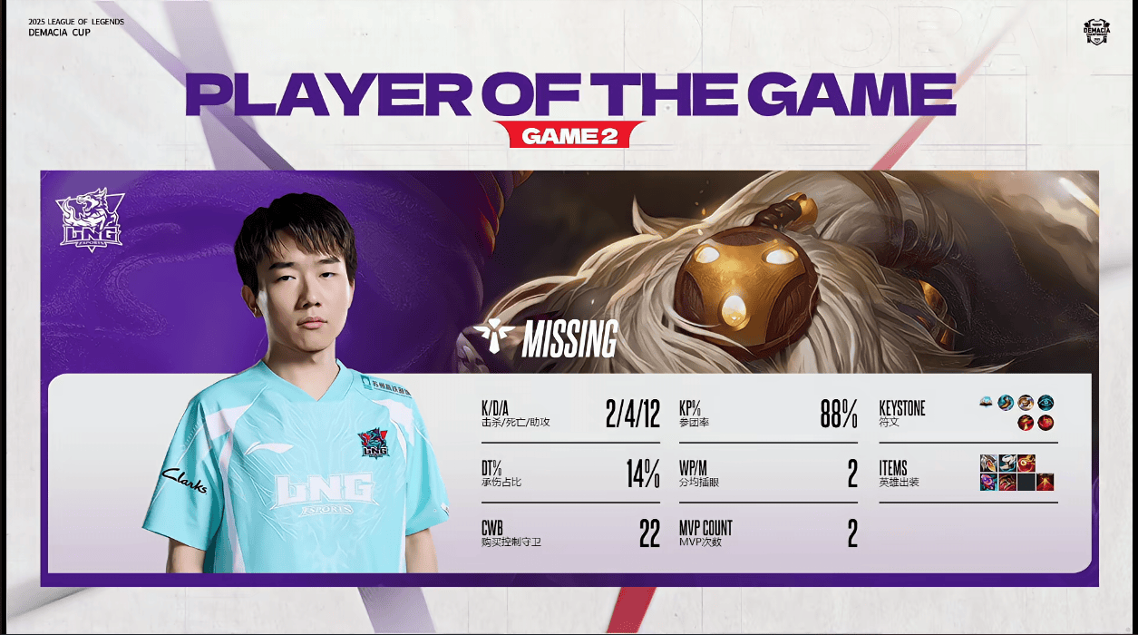 虎扑12月23日讯在刚刚结束的LNG对阵WBG的BO3比赛中,MISSING巴德打出2/4/12战绩,斩获LNG对阵WBG第二局MVP
