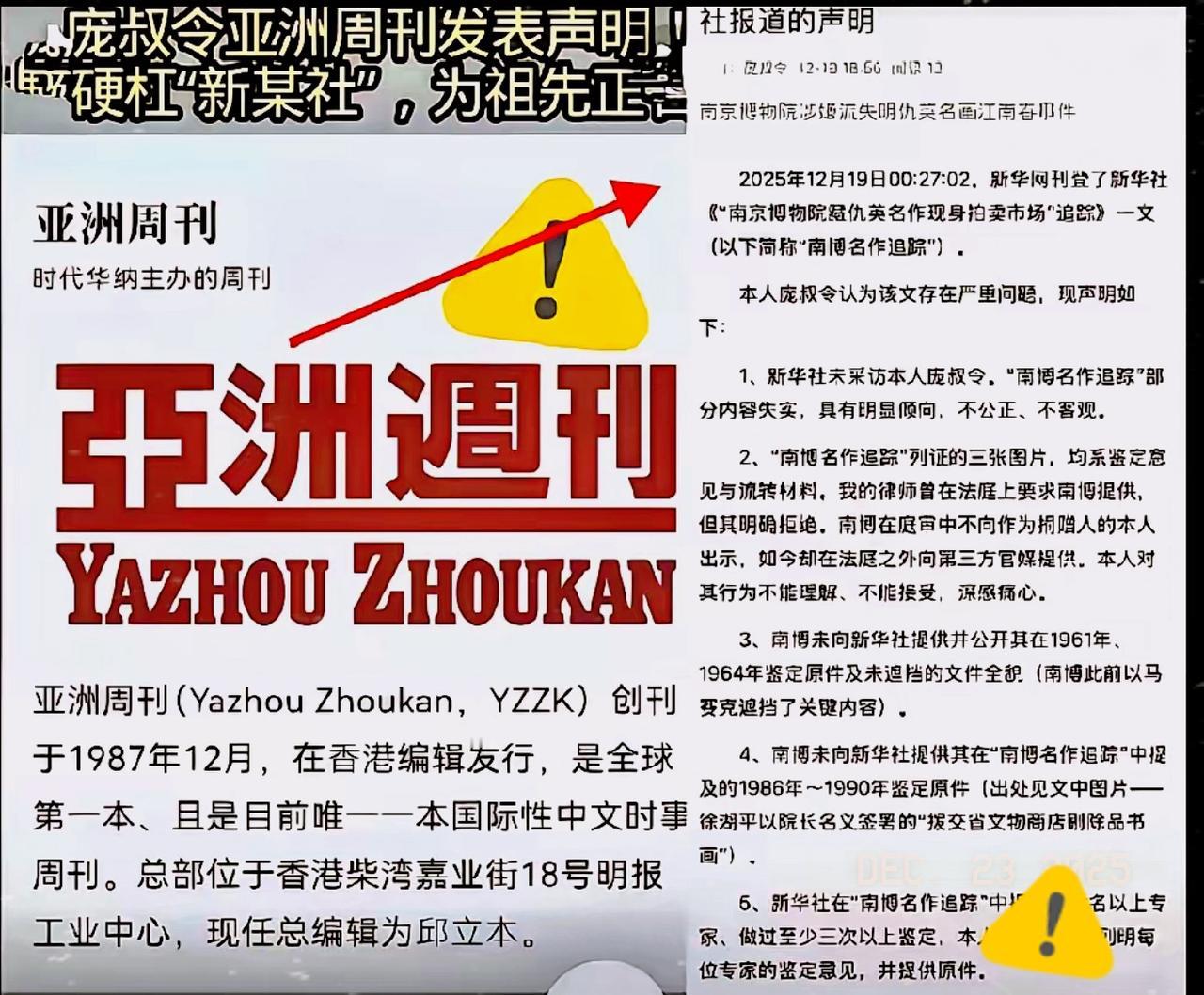 新华社这回踢到钢板了, 真没想到庞叔令这么刚,直接跑到《亚洲周刊》发声明回怼新华社。 新华社这几日遭到强硬而有力的回应,庞叔令也在《亚洲周刊》上发表声明进行反击,她指出新华社在发文之前并没有采访过她和其他当事人,就急于发文抹黑她。 你们知道吗?庞叔令可不是普通老太太,今年都七十多岁了,家住苏州,是民国时期“江南收藏甲天下,虚斋收藏甲江南”的收藏大家庞莱臣的曾孙女!她父亲庞增和1959年怀着一腔爱国心,把家族传承的137件珍贵古画无偿捐给南京博物院,其中就包括明代“明四家”之一仇英的《江南春画卷》,那可是钤盖了12方鉴藏印、著录在《虚斋名画录》里的家族核心藏品,这份情怀和格局,搁谁看了不佩服? 可谁能想到,好心捐赠换来的是几十年后的“釜底抽薪”。1961年、1964年两轮鉴定,南博说《江南春》是“伪作”,上世纪90年代直接从馆藏里剔除,1997年划拨给江苏省文物总店,2001年被个连名字都没留、只写着“顾客”的人以6800元买走!这一系列操作,庞家后人从头到尾一无所知,直到2025年这幅画突然出现在北京嘉德春拍,估价飙到8800万元,24年身价暴涨13000多倍,这事儿换谁能忍? 庞叔令一开始没想着闹大,只是作为捐赠人直系亲属,想讨个说法。2025年她起诉南博,法院都支持了她的权利,调解协议要求南博6月30日前展示全部捐赠藏品原件,可南博只说5件藏品“划拨、调剂”了,具体去向含糊其辞。她申请强制执行,要鉴定原件和流转材料,南博以“涉密”为由拒不给法院,转头却把这些材料主动提供给新华社,让媒体发报道说“处置合规”,这不是明摆着选择性公开吗? 更让人寒心的是新华社的操作。作为权威媒体,报道前连庞叔令的面都没见,电话都没打一个,通篇只引用南博单方面说法,对庞家的诉求、证据、法院调解结果一字不提。新闻报道最讲究客观中立,要全面呈现事实,可这次却成了单方传声筒,用媒体公信力给行政结论背书,这哪是新闻专业主义该有的样子?庞叔令在《亚洲周刊》的声明里直接戳破:南博说画是“全伪作”,可1961年的鉴定记录明明写着“陈鎏题引首真”,陈鎏是明代嘉靖进士,他的墨迹是真的,这画怎么就成了全伪作? 这事儿里还有个关键人物,时任南博副院长的徐湖平,1997年就是他签署文件把1259件文物“剔除”的。他当时身兼数职,既管南博库房,又掌文物店收购权,还是收藏协会会长,集裁判员、运动员于一身,这样的操作怎么可能公平?现在事发了,他出来澄清说“毫不知情”,谁能信啊?做错事不敢认,反而让捐赠人的善意被践踏,太让人失望了。 庞叔令选择在《亚洲周刊》发声也特别有深意,这份国际中文时事周刊能让事件突破局限,变成全球华人关注的公共议题,倒逼相关部门重视。她不是要炒作,只是想查清5件缺失藏品的去向,要回属于家族的文物,更要给所有文物捐赠人争一个保障——如果捐赠后藏品处置不透明,鉴定程序不公开,谁还敢把祖传国宝交给国家? 这起纠纷早就不只是一幅画的真伪之争了,它戳破了文博系统的制度漏洞,也拷问着媒体的客观公正。庞叔令七十多岁还在为祖辈的捐赠维权,为行业的规范发声,这份刚硬和坚持,值得所有人尊重。而新华社这次的失察,也该给所有媒体提个醒:权威不是单方面背书的资本,只有基于事实、平衡各方声音,才能真正赢得公众信任。 各位读者你们怎么看?欢迎在评论区讨论。