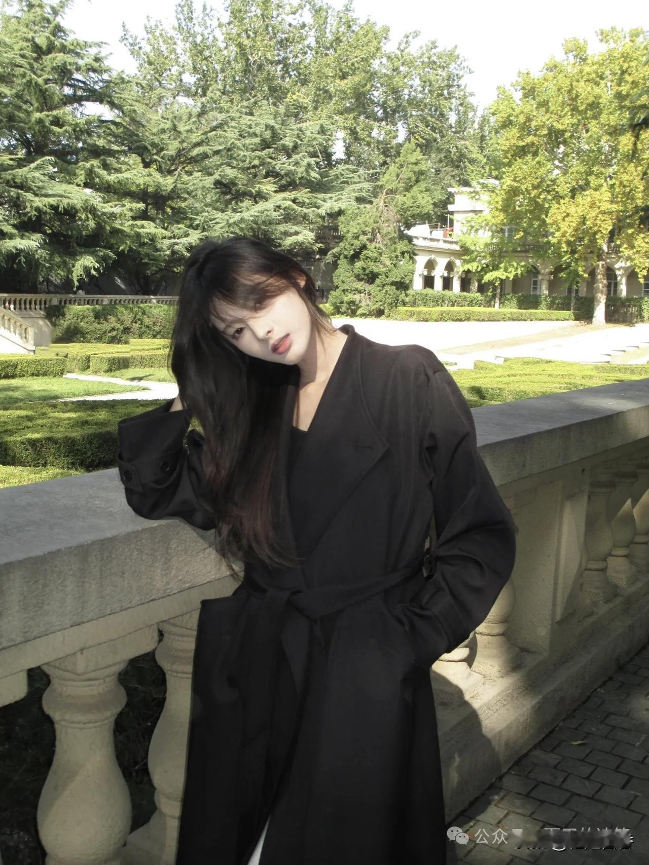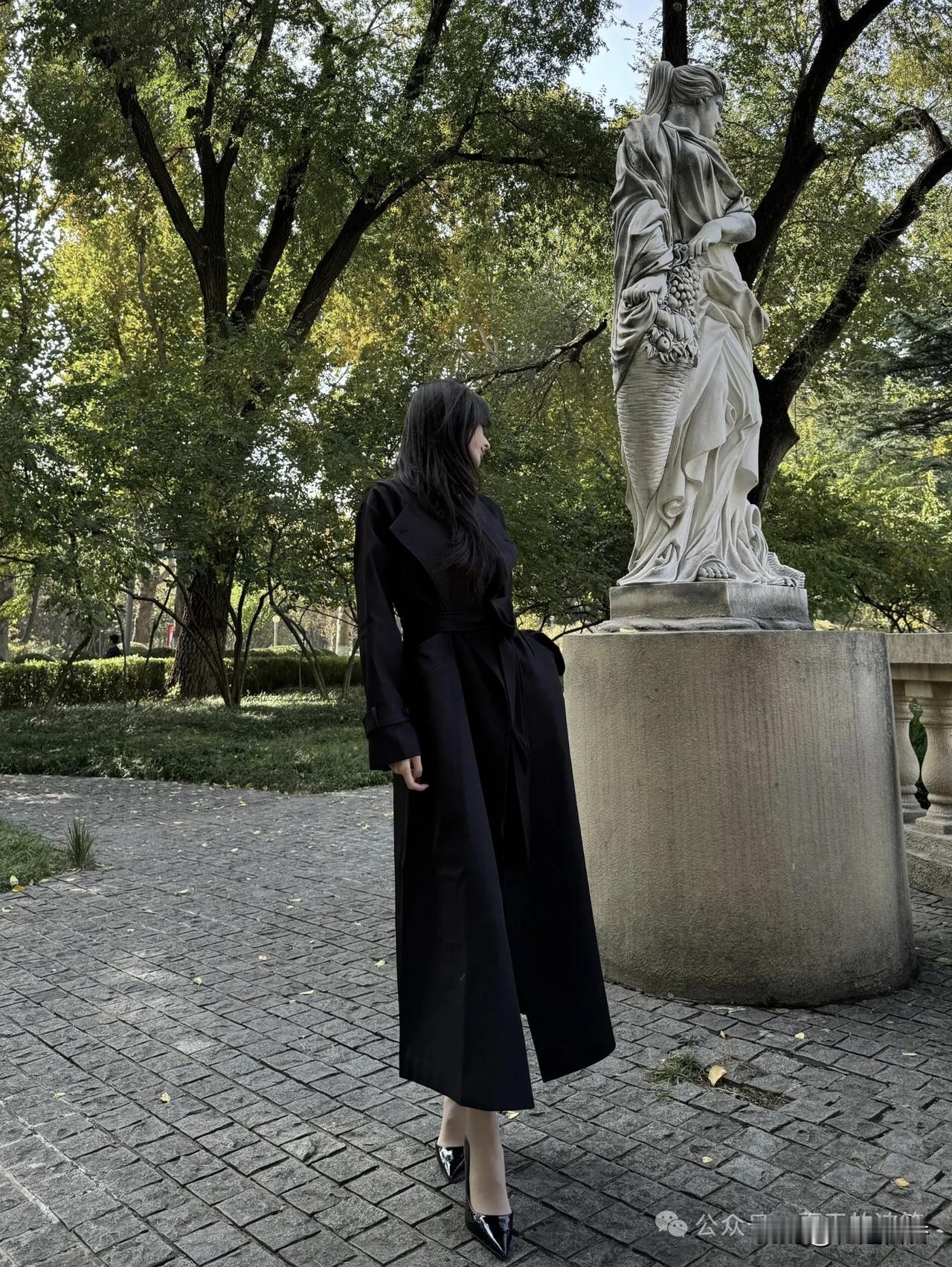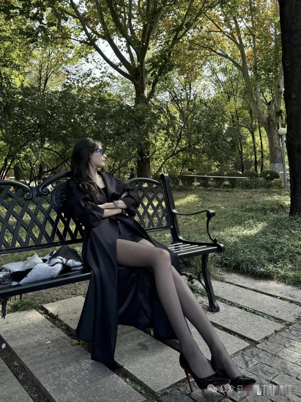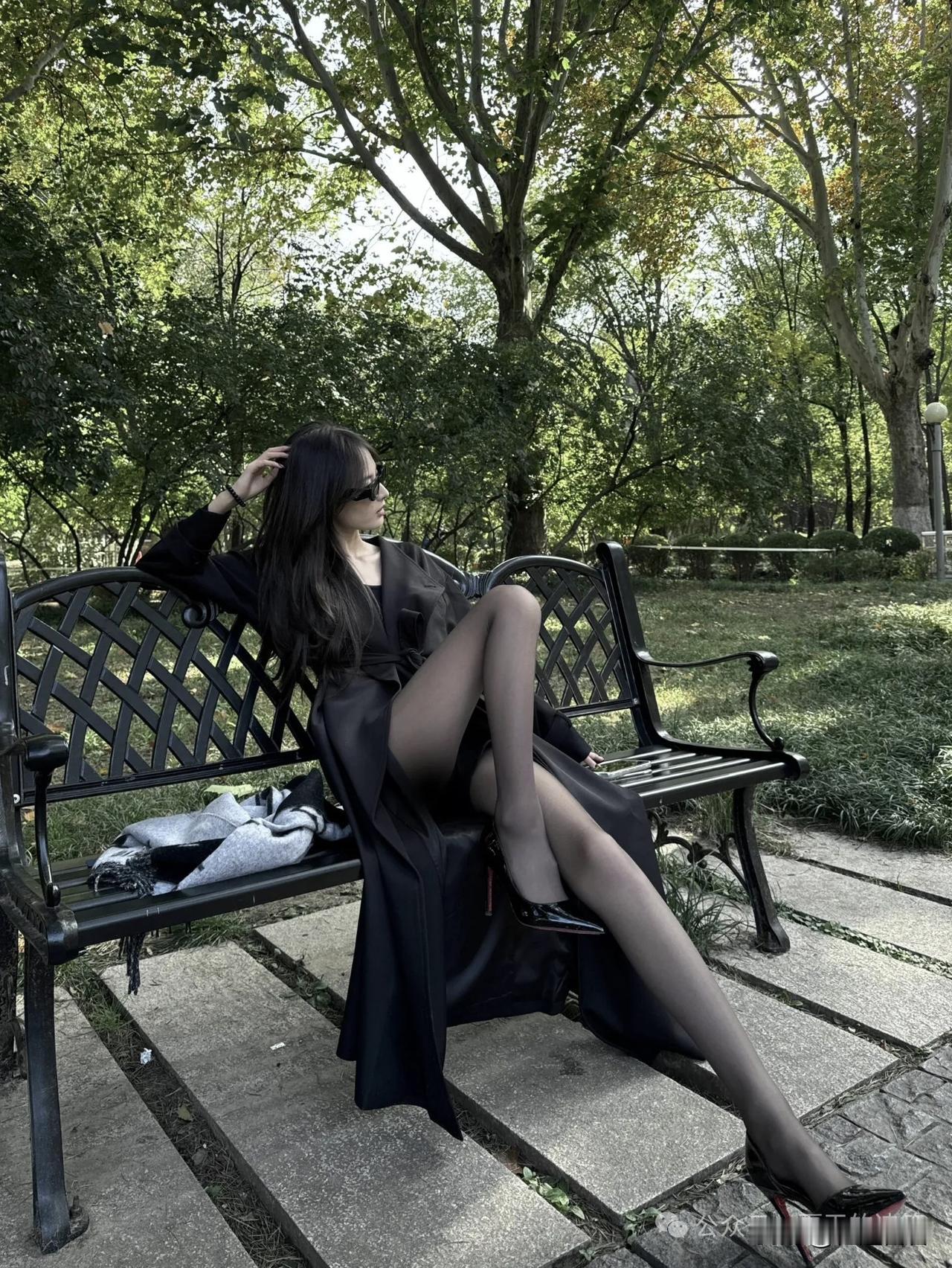 秋日公园,黑衣女子,优雅姿态,享受宁静时光。