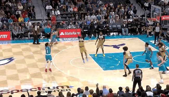 比赛的第四节,拉梅洛-鲍尔空位三分命中,黄蜂本场比赛首次领先两位数分差。