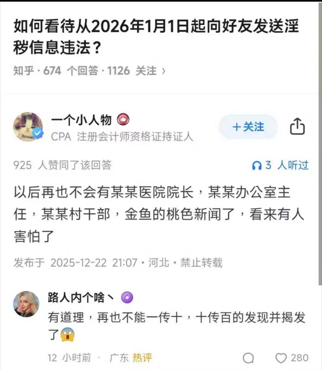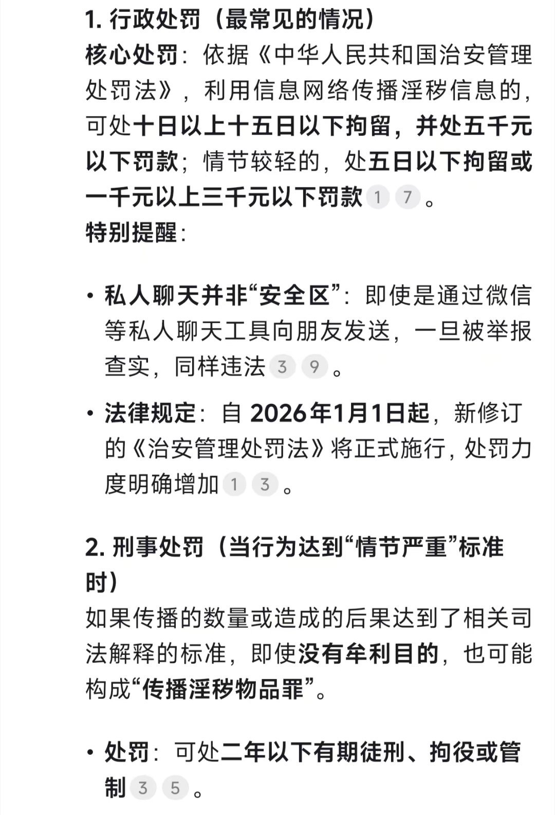 【传播淫秽信息加大处罚专治擦边夫妻互发私密照一般不认定为违法】律师称夫妻间发不雅视频非打击重点夫妻情侣间私密自愿的情趣互动一般不违法;新法对私密场景的处罚有明确边界,不是“一发就罚”,但私聊绝非法外之地 。私聊不是淫秽信息的避风港明年起发淫秽信息违法 温馨提示:网上招嫖就是电信诈骗一、新规核心要点(2026年1月1日起施行) 法条依据:新《治安管理处罚法》第80条 处罚梯度:一般处10-15日拘留,可并处5000元以下罚款;情节较轻处5日以下拘留或1000-3000元罚款;涉未成年人从重处罚 关键修订:把“计算机信息网络”改为“信息网络”,覆盖所有通讯工具;不再限定“公开/不特定对象”,私聊传播也纳入规制 二、夫妻/情侣间能被“打击”吗? 通常不认定违法:核心是无社会危害性——私密、自愿、未扩散、不涉未成年人、内容未达“淫秽”标准。可能被追责的情形:内容经认定为淫秽信息;存在转发扩散(哪怕仅转给少数第三方);胁迫发送或涉及未成年人;以牟利或扰乱秩序为目的传播。- 执法原则:遵循过罚相当与比例原则,重点打击公开传播、群聊扩散、涉未成年人等行为,不会“一刀切”介入正常私密生活 。三、朋友间私聊“带颜色”内容的法律边界。 违法认定三要件(缺一不可) :内容是淫秽信息:经专业认定,以性刺激为目的、具体描绘性行为/性器官的内容;低俗擦边≠淫秽。- 存在传播行为:主动发送、转发、分享;仅接收不传播不违法。主观明知:明知是淫秽信息仍传播;误发、立即撤回且无故意的,通常不认定。常见风险点:兄弟/闺蜜间高频分享、批量转发、跨群扩散,易被认定“情节较重”;涉未成年人直接从重,甚至触及刑事 。四、常见误区澄清1. “淫秽=不雅”:错。“淫秽”是法律概念,有明确违法性;“不雅”多为道德评价,不直接违法 。2. “情侣发私密照就违法”:错。私密自愿、不扩散、不涉淫秽/未成年人,一般不违法。3. “私聊天知地知不会被罚”:错。证据确凿(如转发记录、举报查实)可处罚;传播即可能违法,私密不是放纵理由 。4. “处罚比吸毒重”:错。吸毒属行政或刑事处罚(如强制戒毒),传播淫秽信息是治安处罚;两者违法性质、危害程度、处罚体系不同,不可简单类比。五、合规建议区分“私密情趣”与“淫秽信息”,不转发、不扩散疑似淫秽内容。朋友间聊天守住底线,不批量/高频分享“带颜色”内容,避免触发“情节较重”。严禁涉及未成年人,不传播任何可能危害未成年人的信息。误发后立即撤回并说明,保留证据以证无主观故意。法律的目的是清朗网络、保护权益,而非侵扰正常私密生活;守住边界,才能既享自由又不踩红线。