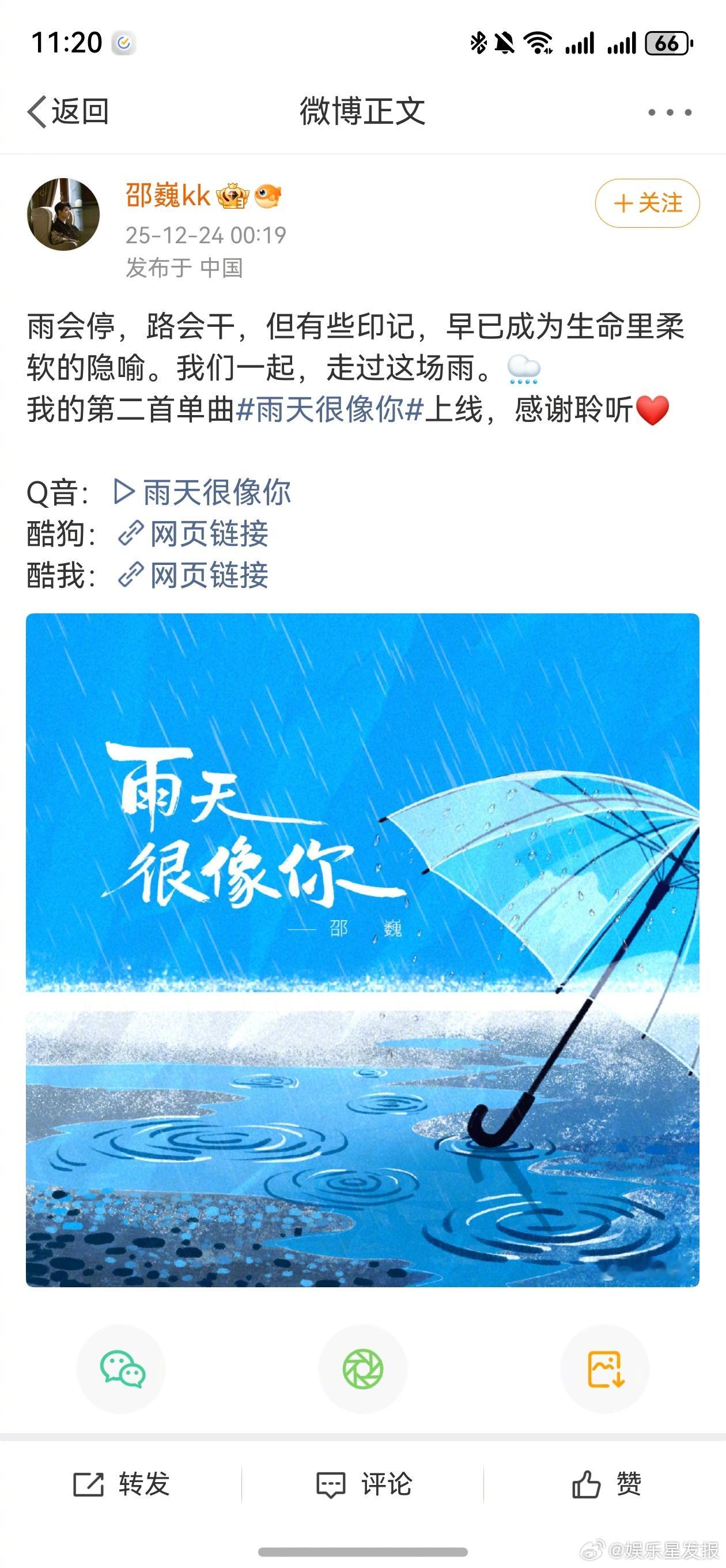 邵巍新歌雨天很像你上线邵巍全新单曲雨天很像你 最新单曲《雨天很像你》将于12月24日正式上线。歌曲以“雨”诗意呈现思念的绵长与回响,细腻刻画情感中的潮湿与留白。让这场“漫长的雨”陪你度过一个充满回忆的冬日吧!