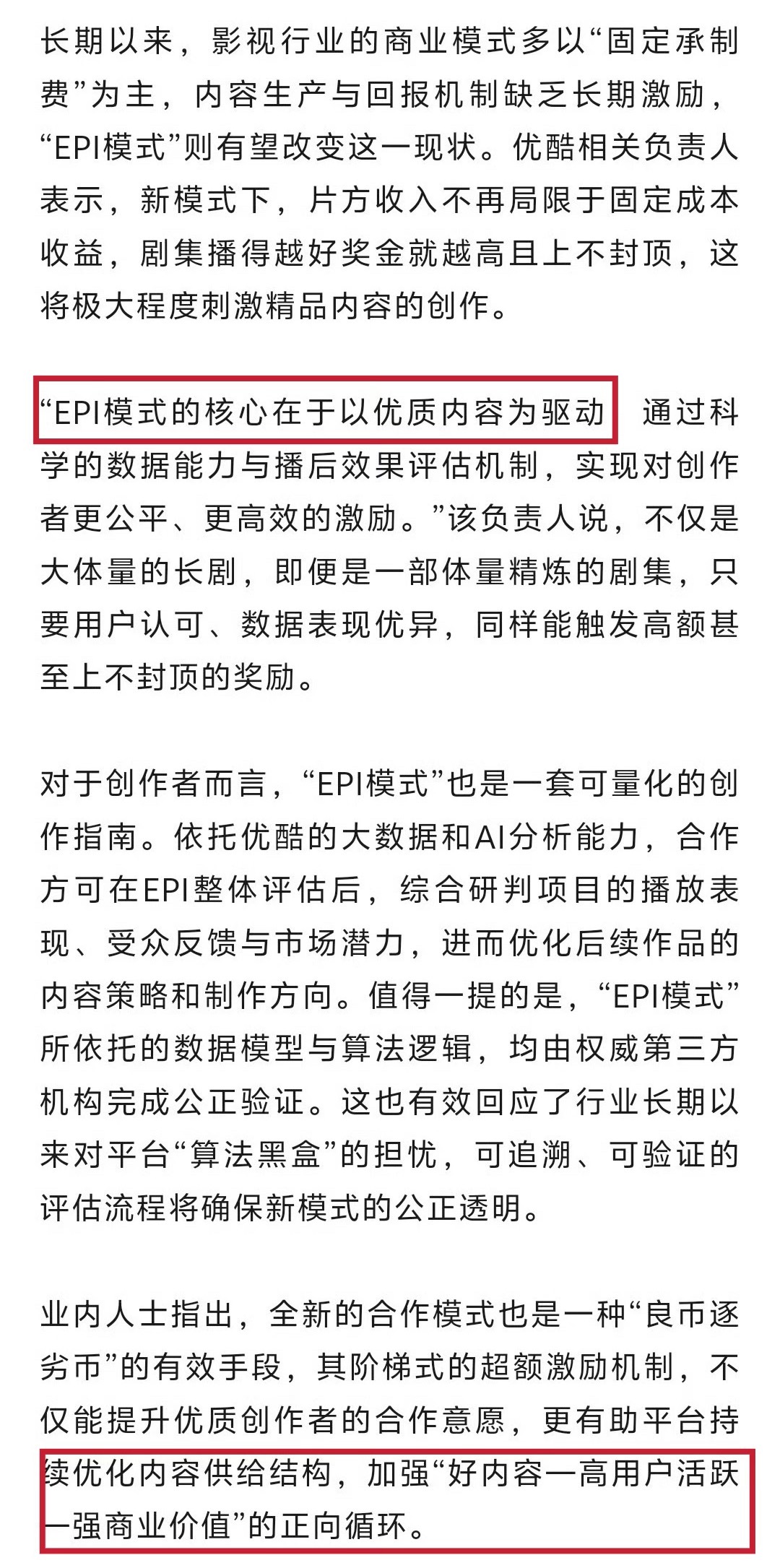 优酷推出EPI(有效播放指数)体系,加强剧集“好内容”“高活跃用户”“高商业价值”的正向循环,看到了吗,这三个这才是平台想要的,内容为先,赚钱是王道,第一次平台明面上直说。平台本来就有自己的内部数据,现在更是推出向外展示的体系,早说了,业内不看云合,这两年长剧行情不行,云合等第三方平台明面上的虚假繁荣已经影响到平台了。影视寒冬,干扰市场良性运转的第三方公司除了粉圈自嗨,慢慢也会被淘汰。