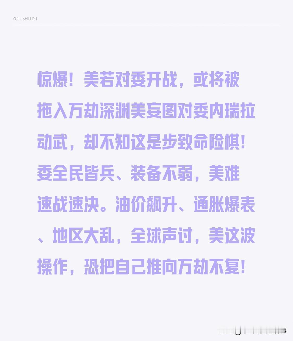惊爆!美国若对委内瑞拉开战,恐深陷万劫深渊 美国妄图武力干涉委内瑞拉,却未意识到这是致命险招。委内瑞拉全民皆兵且装备不弱,美国难以速战速决。一旦开战,油价飙升、通胀爆表、地区动荡,还会遭全球声讨,美国此举或让自己万劫不复!