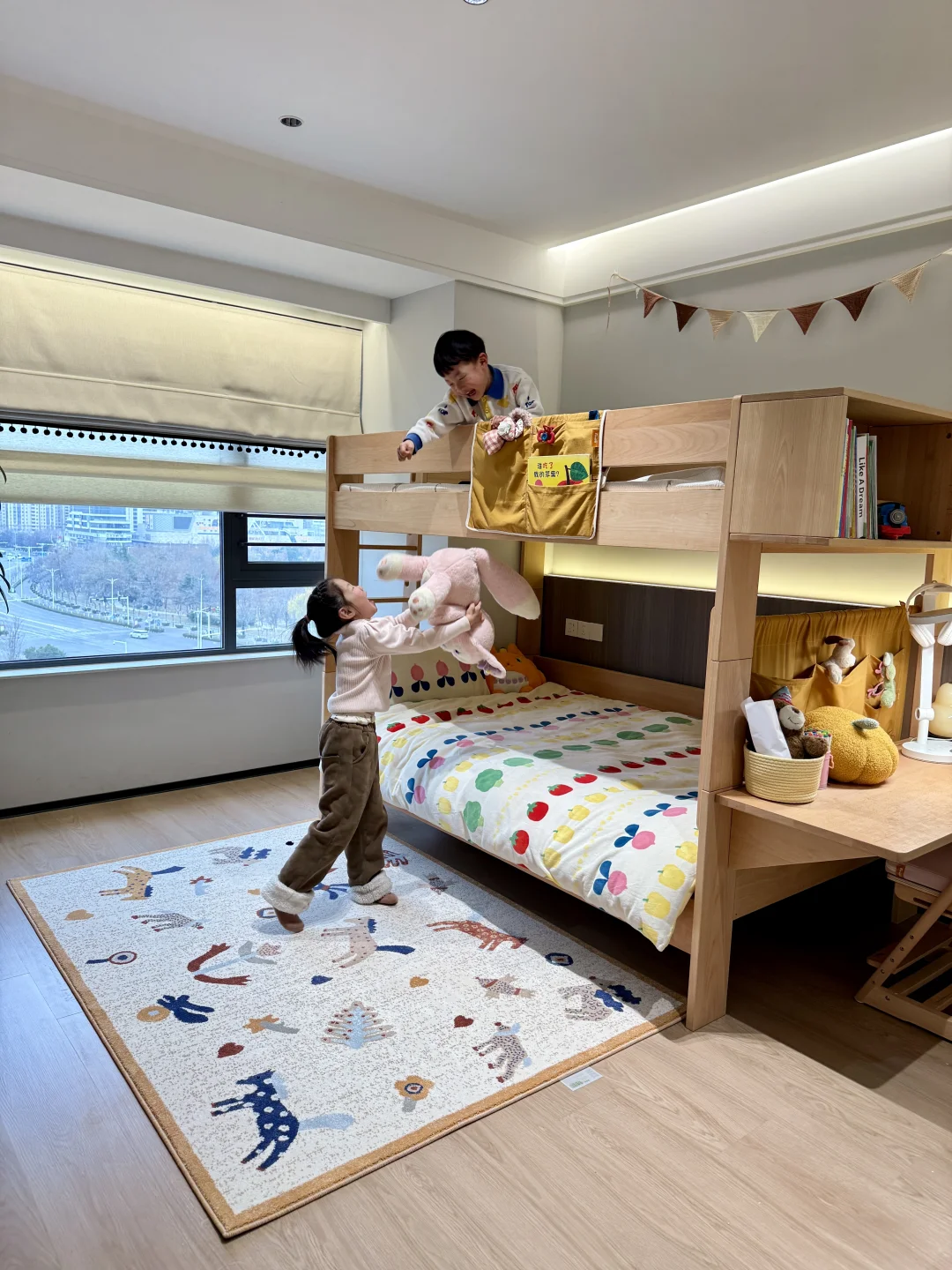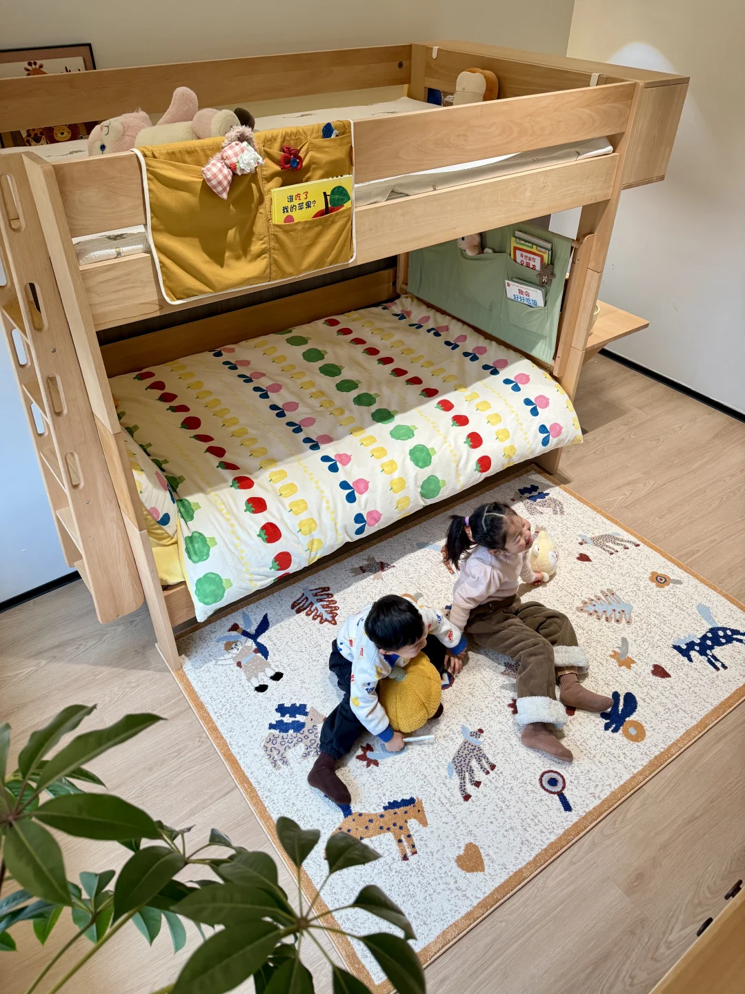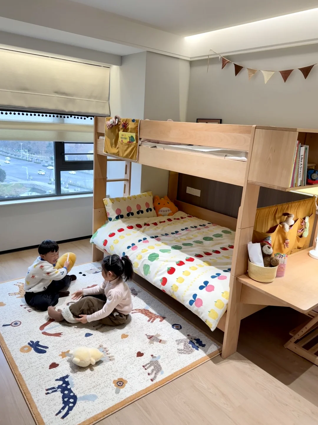 ✅两个孩子一间儿童房,只有一张多功能床+一张无胶的童趣地毯就能搞定,简单又实用~