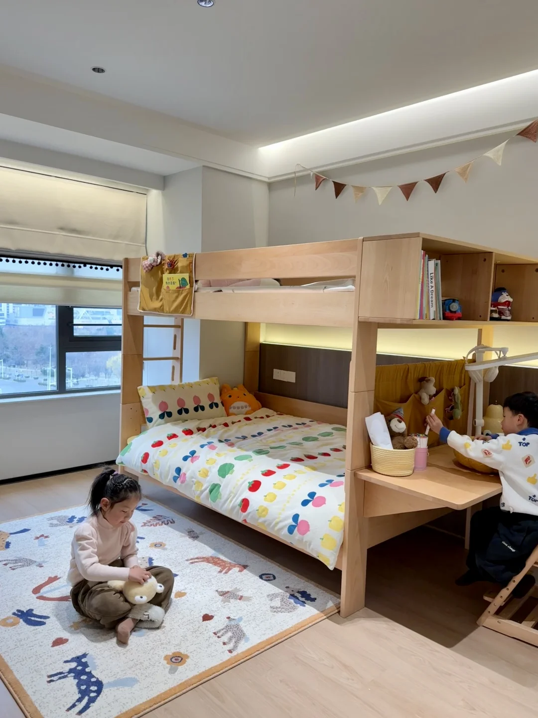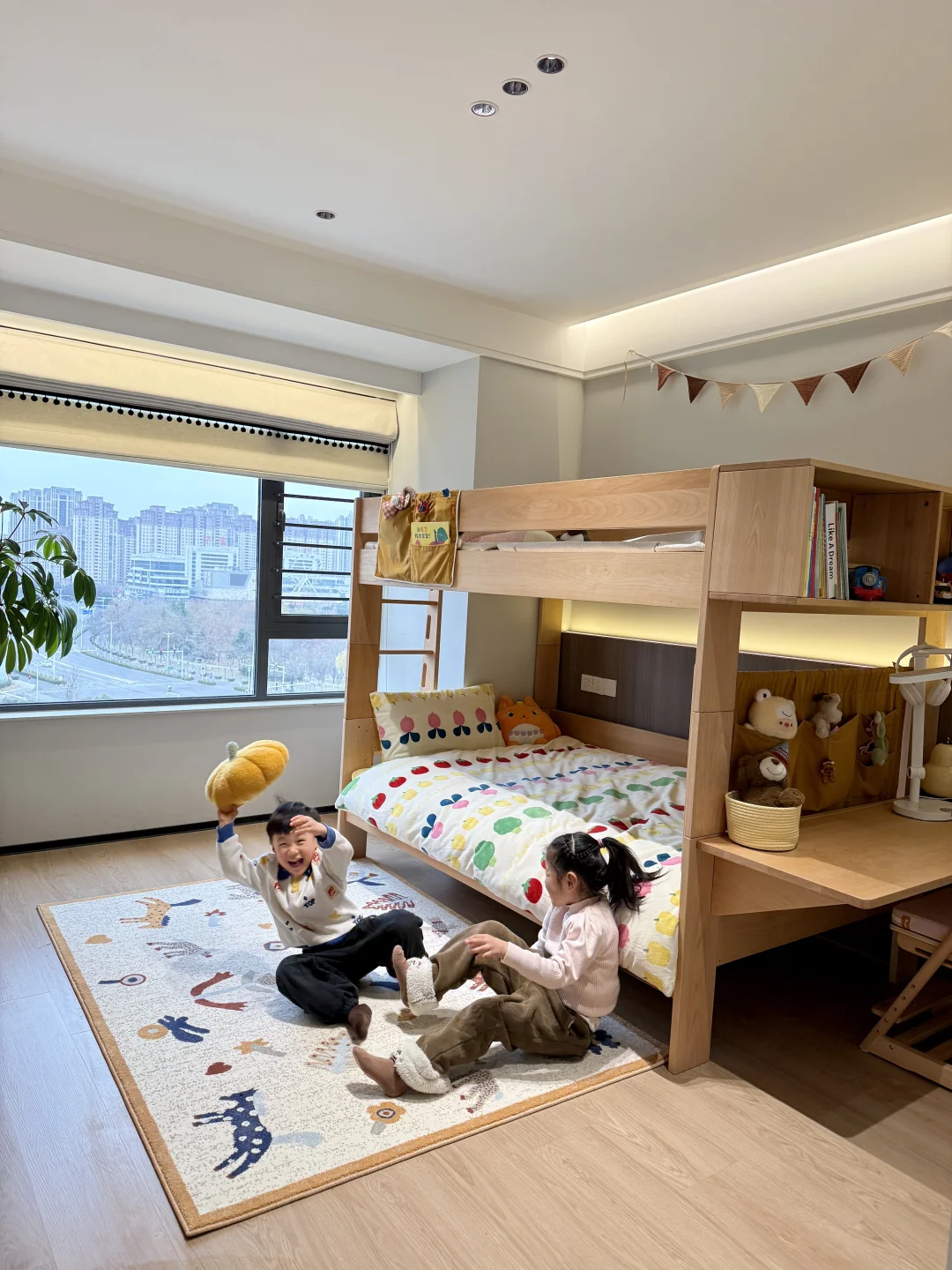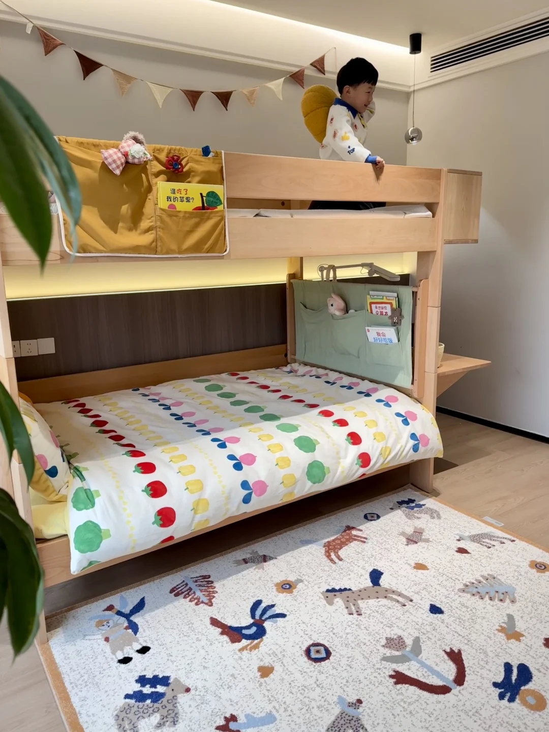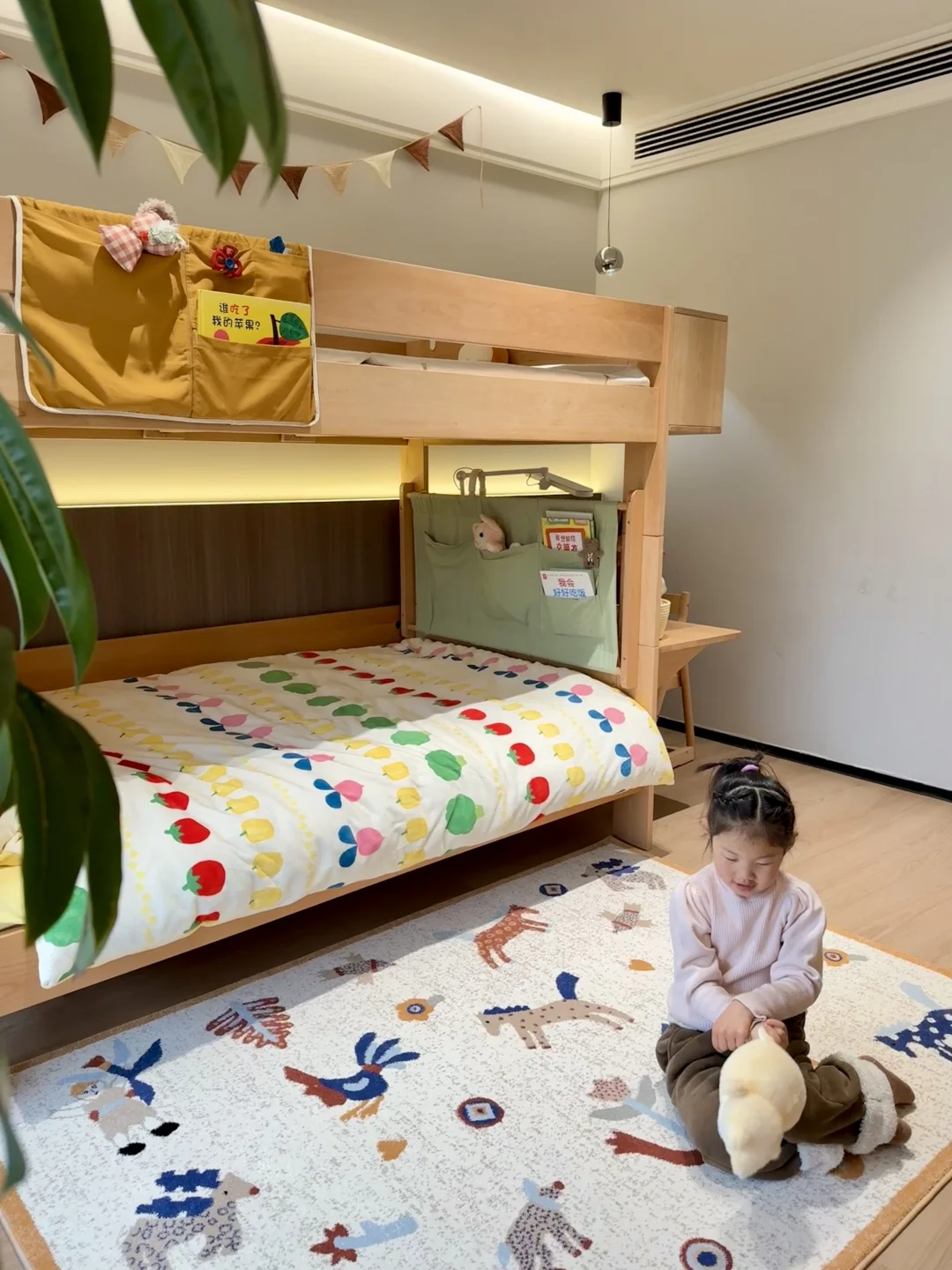 ✅两个孩子一间儿童房,只有一张多功能床+一张无胶的童趣地毯就能搞定,简单又实用~