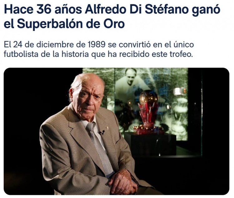 1989年12月24日,阿尔弗雷多·迪斯蒂法诺被授予超级金球奖,《法国足球》杂志以此向这位皇马传奇的伟大职业生涯致敬,他在最终评选中力压克鲁伊夫与普拉蒂尼,至今为此,《法国足球》只颁发过此奖项一次,因此迪斯蒂法诺是唯一拥有此项荣誉的足球运动员。