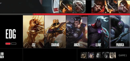 EDG选用:Zdz贾克斯、Xiaohao赵信、Angel沙皇、Leave韦鲁斯、Parukia蕾欧娜