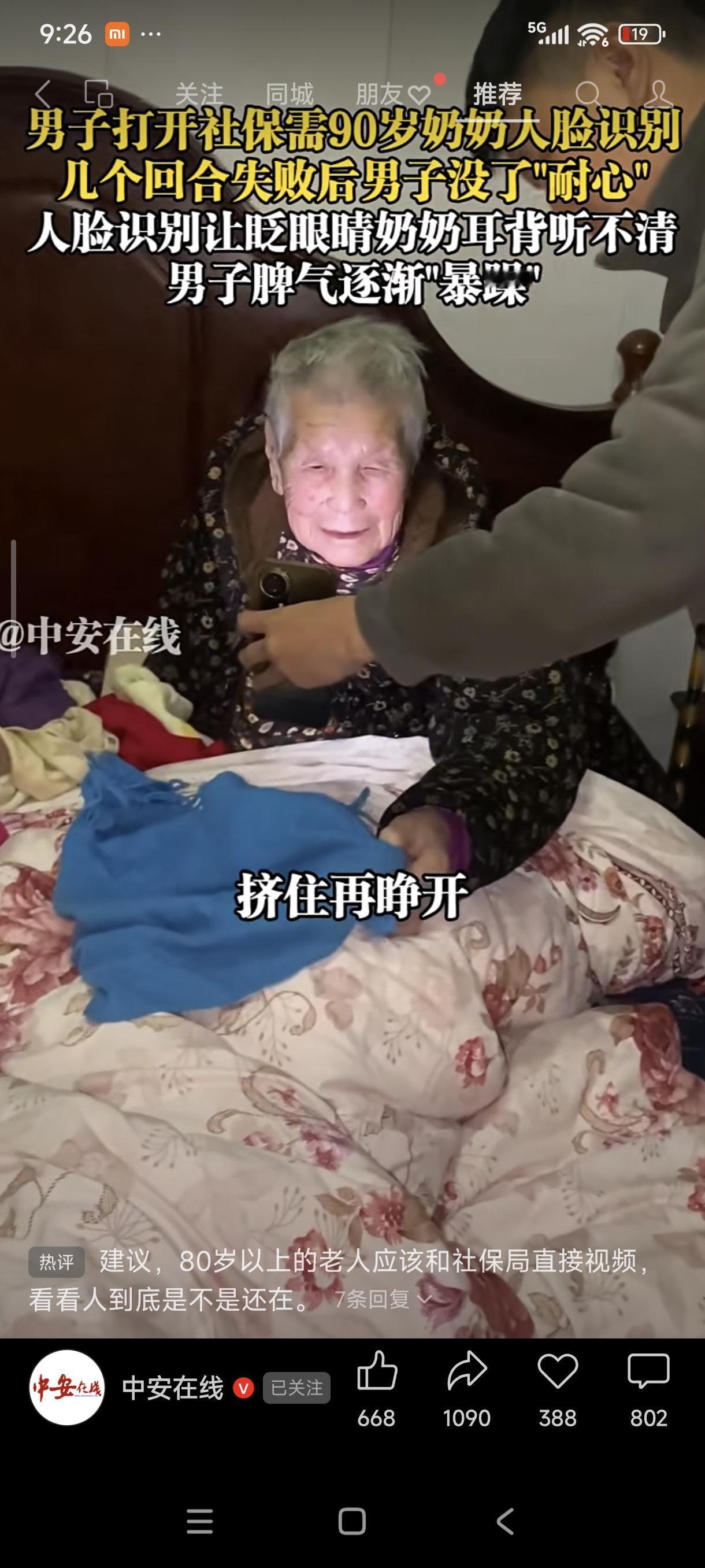 河南,90岁的老奶奶,在社保刷脸实名认证时,因耳背听不清楚,认证了好几次均失败了,气的男子大声喊叫,老人像犯了错一样,不敢吭声,只能露出勉强的微笑! 12月23日,据“中安在线”报道,一位90岁的老奶奶坐在床上,一位年轻男子拿着手机帮老奶奶进行社保实名认证,认证过程中,男子让老奶奶“挤挤眼”“摇摇头”,可老奶奶耳背听不清楚,动作缓慢,总是认证不上。一开始,男子比较有耐心,语气缓和的教老奶奶怎么做,可几个回合下来,就是认证不上,气的男子大喊:“看着我,挤一挤眼”,可老奶奶一脸茫然,对着手机屏幕还是不知道怎么做,“挤挤眼”男子大喊道,可老人还是不明白怎么做。这一幕看着让人有些心酸!科技的进步,终究还是把老年人抛弃了! 现在在农村,过了60岁的老人,每年都需要进行实名认证,也就是拿手机刷脸认证,有些年龄不太大的会自己操作,有些年龄大的根本就不会自己操作,需要他人帮其操作,有些根本在手机上认证不过。光这个实名认证,有些就需要折腾好长时间。对于那些耳背失明的老人,是难上加难,要是今年认证不过,相应的补助就发不下来。 如果没有人帮忙认证,好多老人根本不知道怎么操作。建议这种实名认证采用多元化的方式进行认证,不能只依赖于手机APP,应该保留线下服务,建议采用电话认证、视频认证、或者上门认证,为那些需要的老人提供“便民服务”。