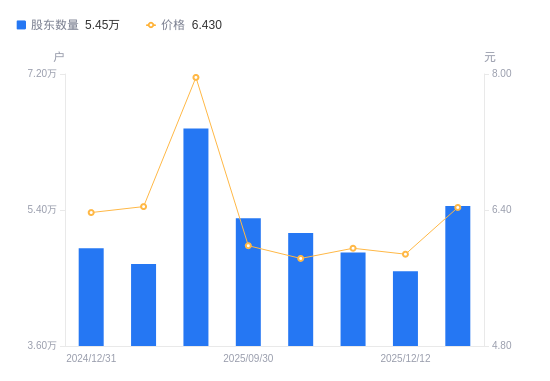 日期A股户数(户)流通A股户均持股数(股)户均持股市值(万元)2025-12-205453611335.027.292025-12-124590813465.347.922025-11-204839112774.417.602025-10-315095912130.677.072025-09-305289811686.016.992025-06-30647979540.057.592025-03-314685913192.068.502024-12-314895312627.768.042024-09-304709513125.957.352024-06-304739313043.425.87