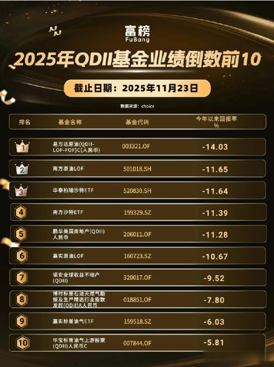 ⚡更值得警惕的是,部分看似“分散配置”的FOF型QDII同样未能幸免。易方达原油(QDII-LOF-FOF)虽通过基金中基金结构运作,但底层资产仍高度集中于能源领域,未能有效对冲单一行业风险,最终成为年内亏损最惨重的QDII产品。