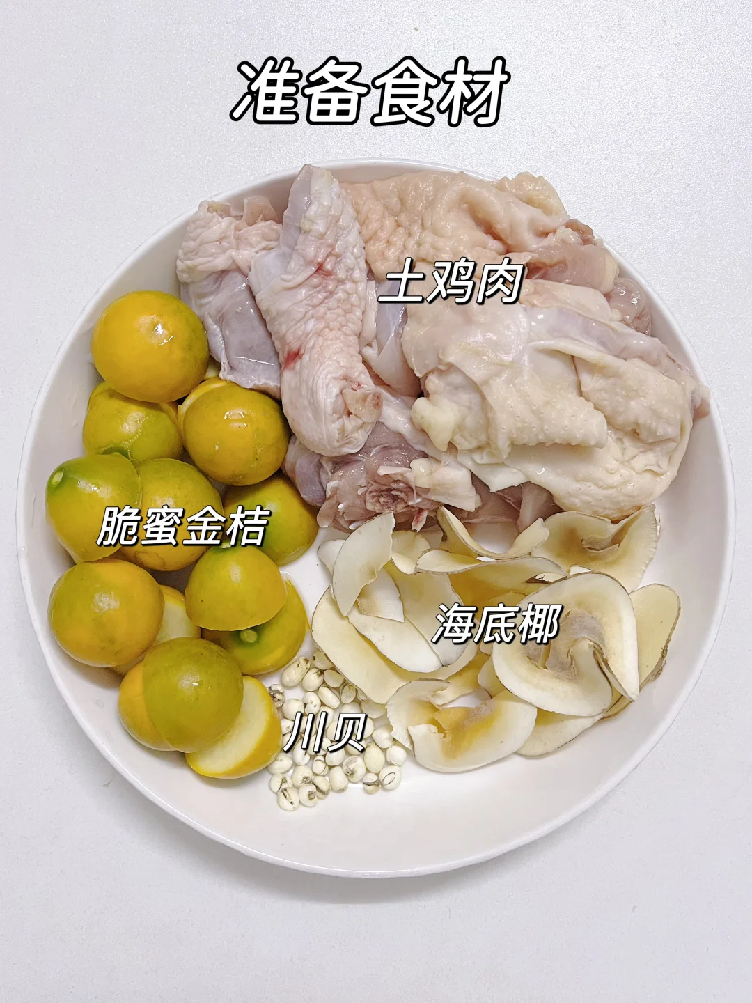 土鸡半只、脆蜜金桔10颗、海底椰片10克、川贝5克