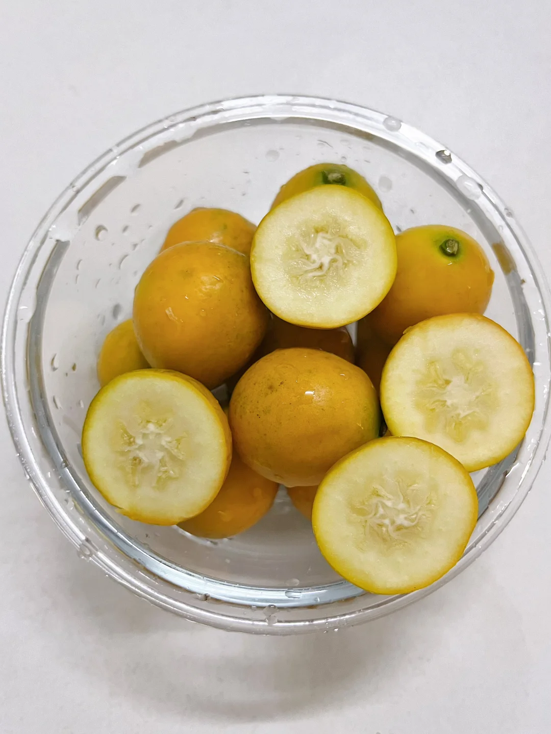 1️⃣ 鸡肉用淀粉洗净,金桔洗净切两半,川贝压碎,海底椰洗净。